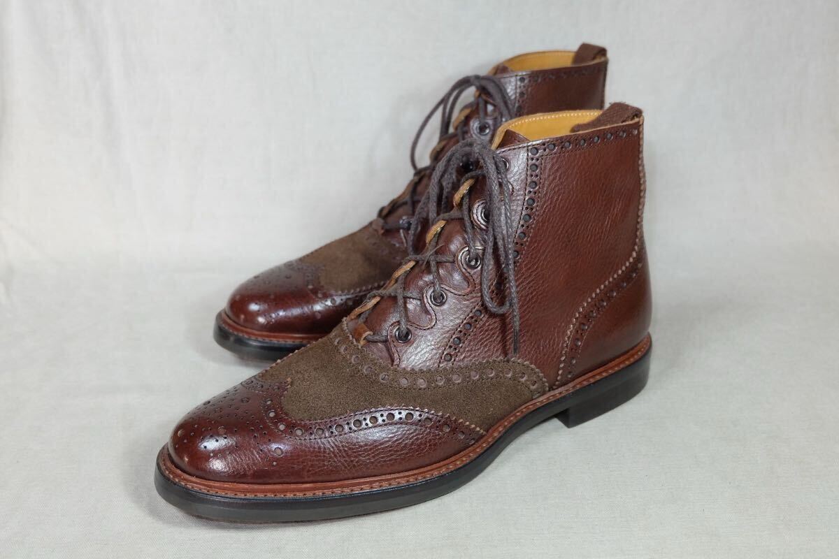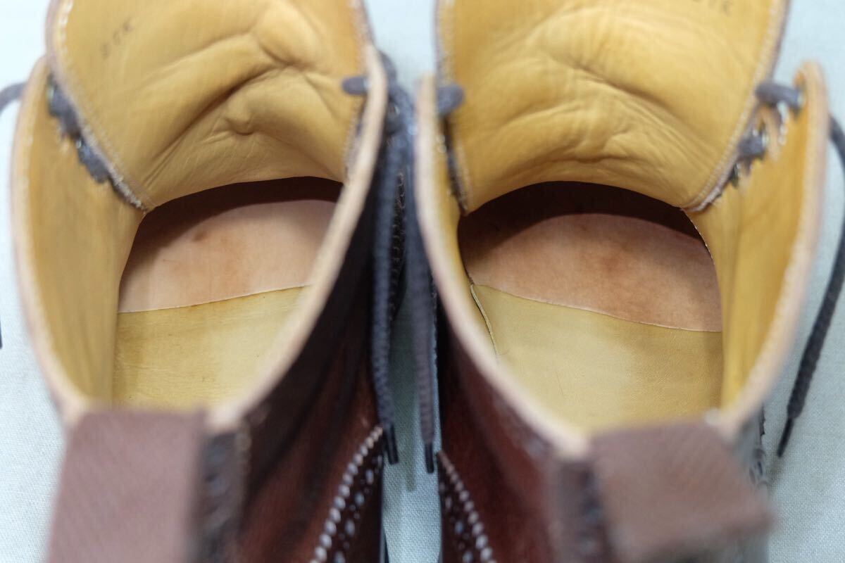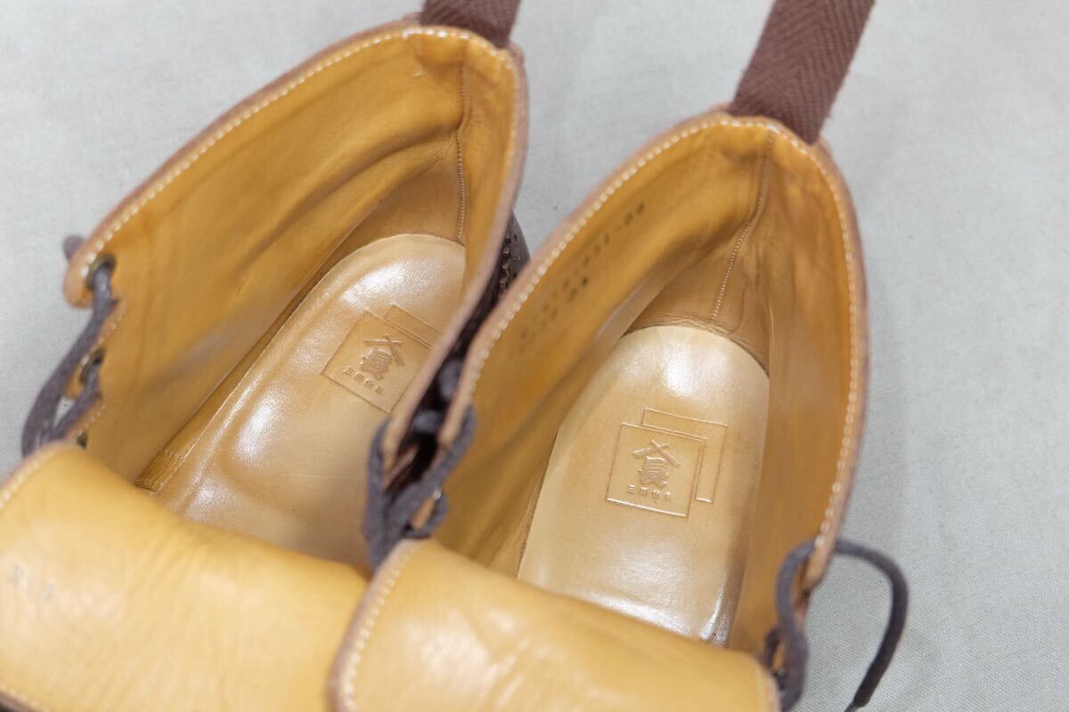 この度はアクセスありがとうございます。 日本の歴史ある老舗高級ハンドメイドシューズファクトリー三陽山長の革質、作り、デザインすべてが上質なハンドメイドコンビギリーブーツになります。希少で現在で廃盤になってしまった英介という一足で、アッパーには最高級グレインカーフレザーとスエードレザーをコンビで使用し、革を贅沢に使用する上に製作にも手間のかかる極上の一足です。製法は日本伝統の堅牢なGoodyearWelted製法で丁寧に仕上げられ、ソールもダブルソールに悪路でもご使用可能で見た目も美しいdainiteラバーソールと近いvibramソールで作られた質実剛健で美しい1足です。アッパー、ライニング、インソール(中底)とほとんどがレザーで作られた日本の伝統とエレガントが詰まった仕上がりとなっております。レザーソールにクラシックなパターン、美しくエレガントな木型などトリッカーズならではのハンドメイドが詰まった極上の1足です。 ジョンロブ、オールデン、ハインリッヒディンケラッカー、チャーチ、J.M.WESTONなど質実剛健な本格靴がお好きな方にオススメです。この機会にぜひご検討よろしくお願いします。 サイズ:UK8.5(日本サイズ約27cm) 型:コンビギリーブーツ、カントリーブーツ、ギリーシューズ アウトソール:31.4cm ソール最大幅:11.1cm ソール:vibramソール カラー:ブラウン 製産国:日本 素材:イタリア製グレインカーフレザー×スエードレザー ライニング:レザーライニング 状態:10段階中【9】 アッパー:まだまだ永くご使用いただける美品です。 ソール:まだまだ永くご使用いただける美品です。 付属品:なし 基本的にはノークレームノーリターンなのでご不明点等あればお気軽にご質問、ご連絡ください。 注意事項 確認はしておりますが、中古品のため小さなキズ、汚れ等を見落とす場合があるので神経質な方はご入札をお控えください。 サイズはあくまで標準的なサイズ感なので、実寸やメーカーサイズをご参考頂きますようお願いいたします。 三日以内にご連絡いただけない場合、評価の末再出品させていただきますのでご了承ください。 | |||