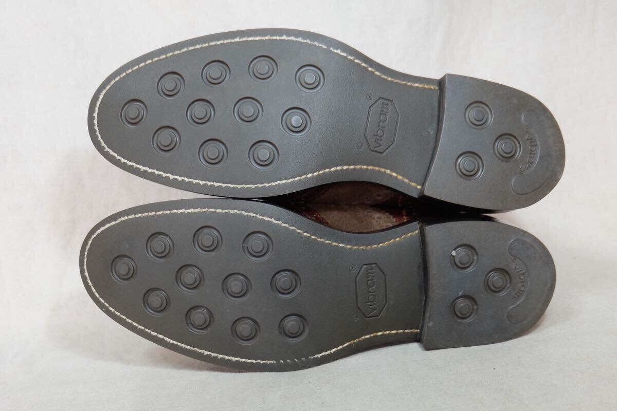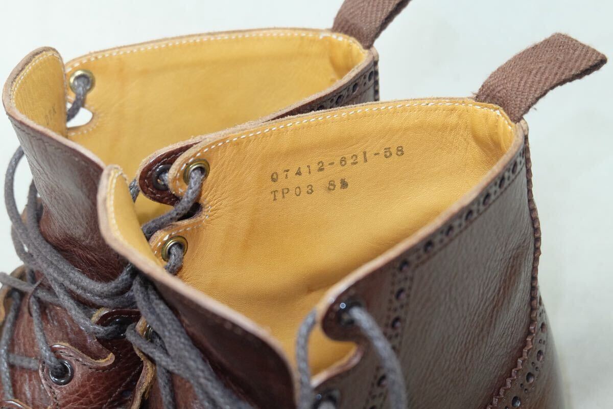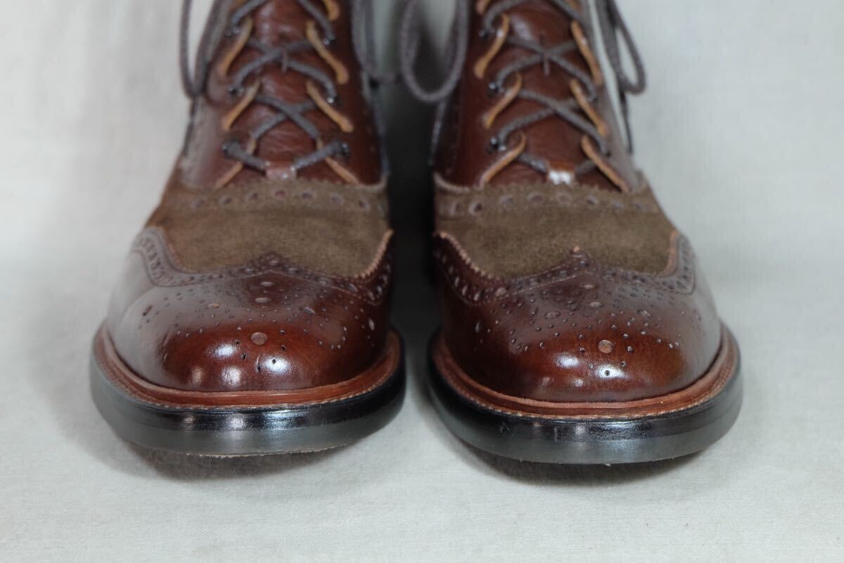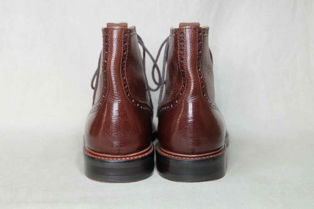 この度はアクセスありがとうございます。 日本の歴史ある老舗高級ハンドメイドシューズファクトリー三陽山長の革質、作り、デザインすべてが上質なハンドメイドコンビギリーブーツになります。希少で現在で廃盤になってしまった英介という一足で、アッパーには最高級グレインカーフレザーとスエードレザーをコンビで使用し、革を贅沢に使用する上に製作にも手間のかかる極上の一足です。製法は日本伝統の堅牢なGoodyearWelted製法で丁寧に仕上げられ、ソールもダブルソールに悪路でもご使用可能で見た目も美しいdainiteラバーソールと近いvibramソールで作られた質実剛健で美しい1足です。アッパー、ライニング、インソール(中底)とほとんどがレザーで作られた日本の伝統とエレガントが詰まった仕上がりとなっております。レザーソールにクラシックなパターン、美しくエレガントな木型などトリッカーズならではのハンドメイドが詰まった極上の1足です。 ジョンロブ、オールデン、ハインリッヒディンケラッカー、チャーチ、J.M.WESTONなど質実剛健な本格靴がお好きな方にオススメです。この機会にぜひご検討よろしくお願いします。 サイズ:UK8.5(日本サイズ約27cm) 型:コンビギリーブーツ、カントリーブーツ、ギリーシューズ アウトソール:31.4cm ソール最大幅:11.1cm ソール:vibramソール カラー:ブラウン 製産国:日本 素材:イタリア製グレインカーフレザー×スエードレザー ライニング:レザーライニング 状態:10段階中【9】 アッパー:まだまだ永くご使用いただける美品です。 ソール:まだまだ永くご使用いただける美品です。 付属品:なし 基本的にはノークレームノーリターンなのでご不明点等あればお気軽にご質問、ご連絡ください。 注意事項 確認はしておりますが、中古品のため小さなキズ、汚れ等を見落とす場合があるので神経質な方はご入札をお控えください。 サイズはあくまで標準的なサイズ感なので、実寸やメーカーサイズをご参考頂きますようお願いいたします。 三日以内にご連絡いただけない場合、評価の末再出品させていただきますのでご了承ください。 | |||