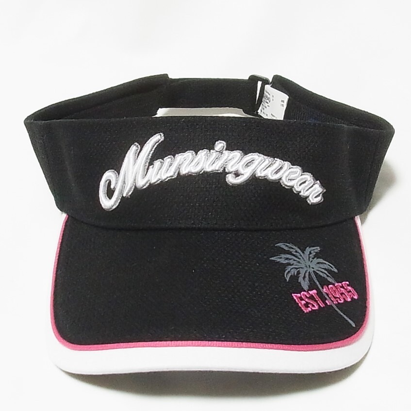 マンシングウェア 美品 サンバイザー 黒 ヤシの木プリント フリーサイズ◎前面 刺繍 Munsingwear◎清掃済み