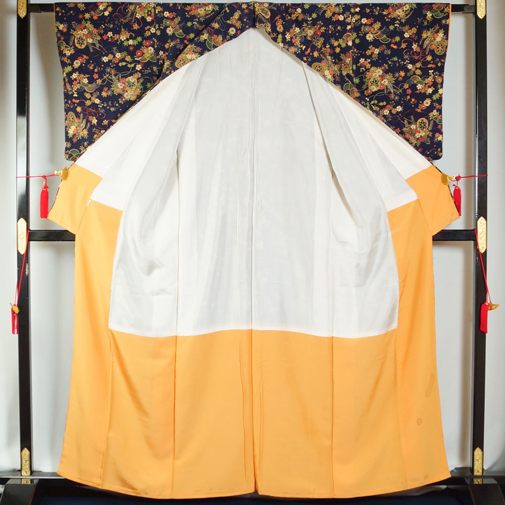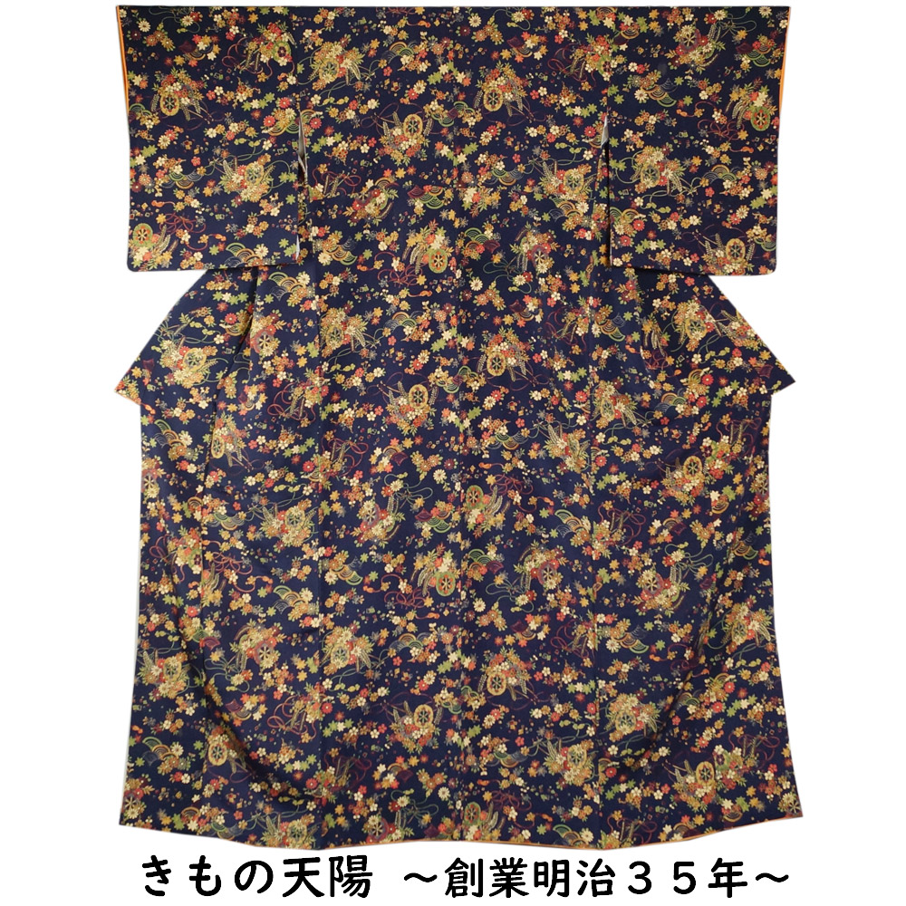 | 商品 説明 | 濃紺色系のちりめん地に花車に青海波、春秋百花模様が染められた小紋です。小田急扱い、タグも付いております。 |