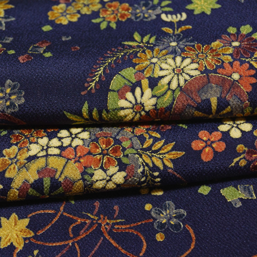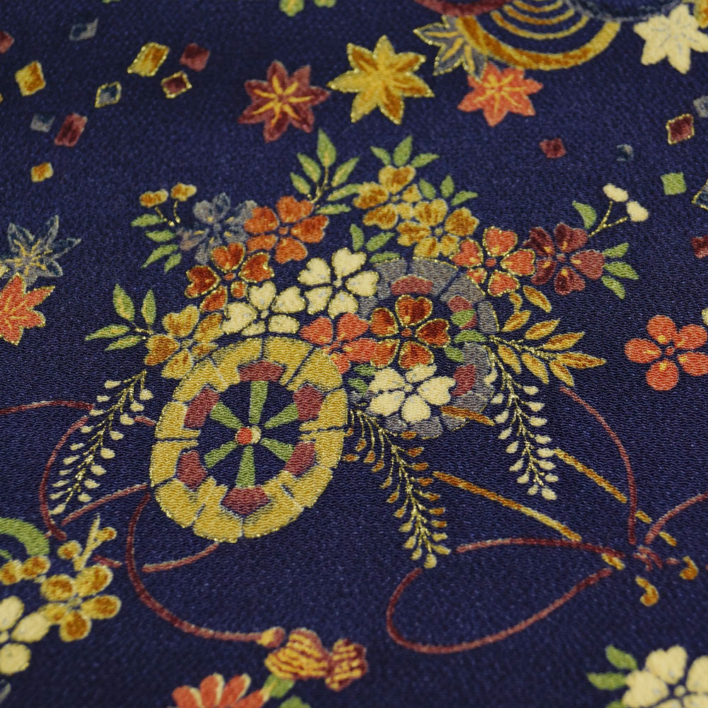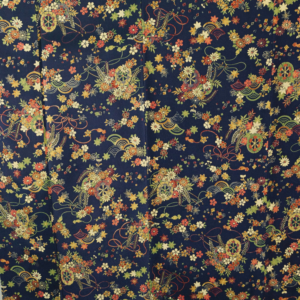 | 品 名 | 小紋 小田急扱い 難有品 着物リメイク・リフォーム用 素材用 花車に青海波、春秋百花模様 濃紺色系 ちりめん Mサイズ 【中古 小紋 リサイクル リサイクル着物 小紋 中古 リサイクル小紋 コモン 正絹 踊り着物 仕立て上がり お茶 踊り 】 | ||