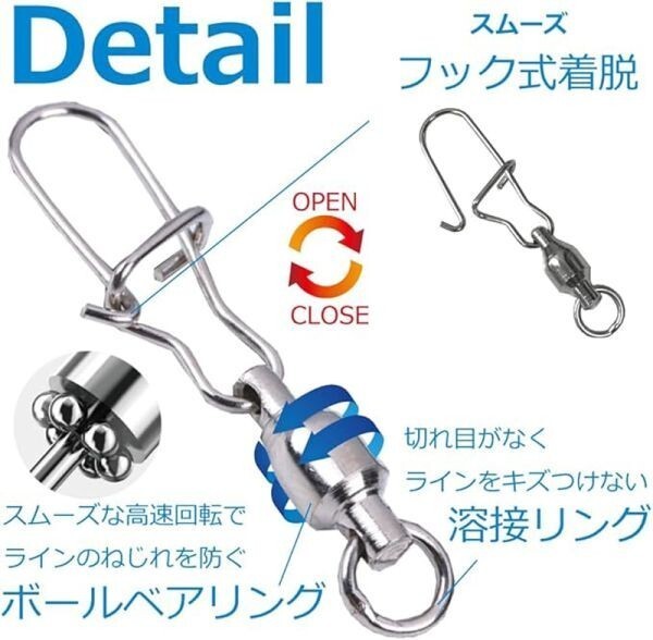 ステンレス素材により耐久性に優れ錆びにも強く、高回転ボールベアリングでラインのねじれを防ぎます。