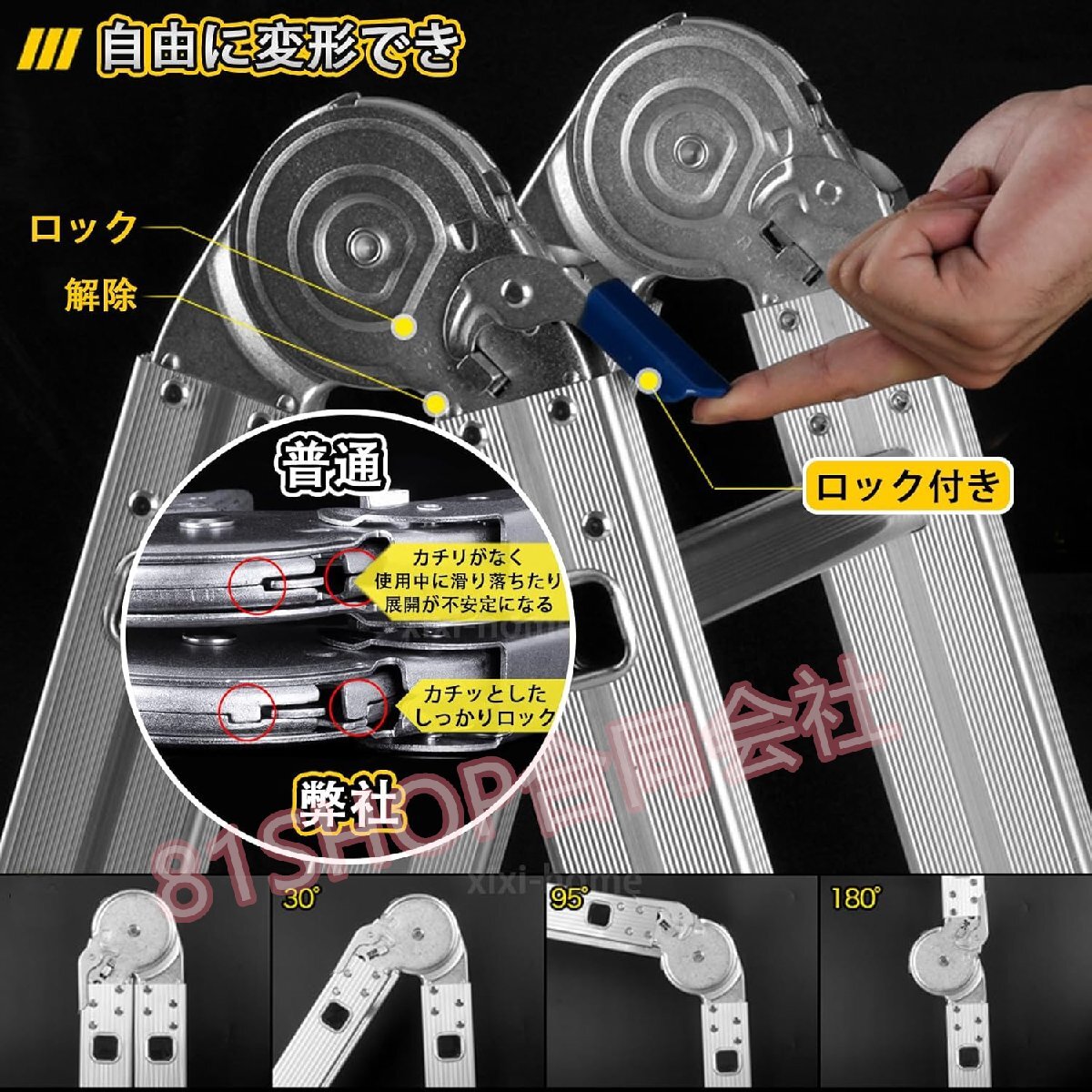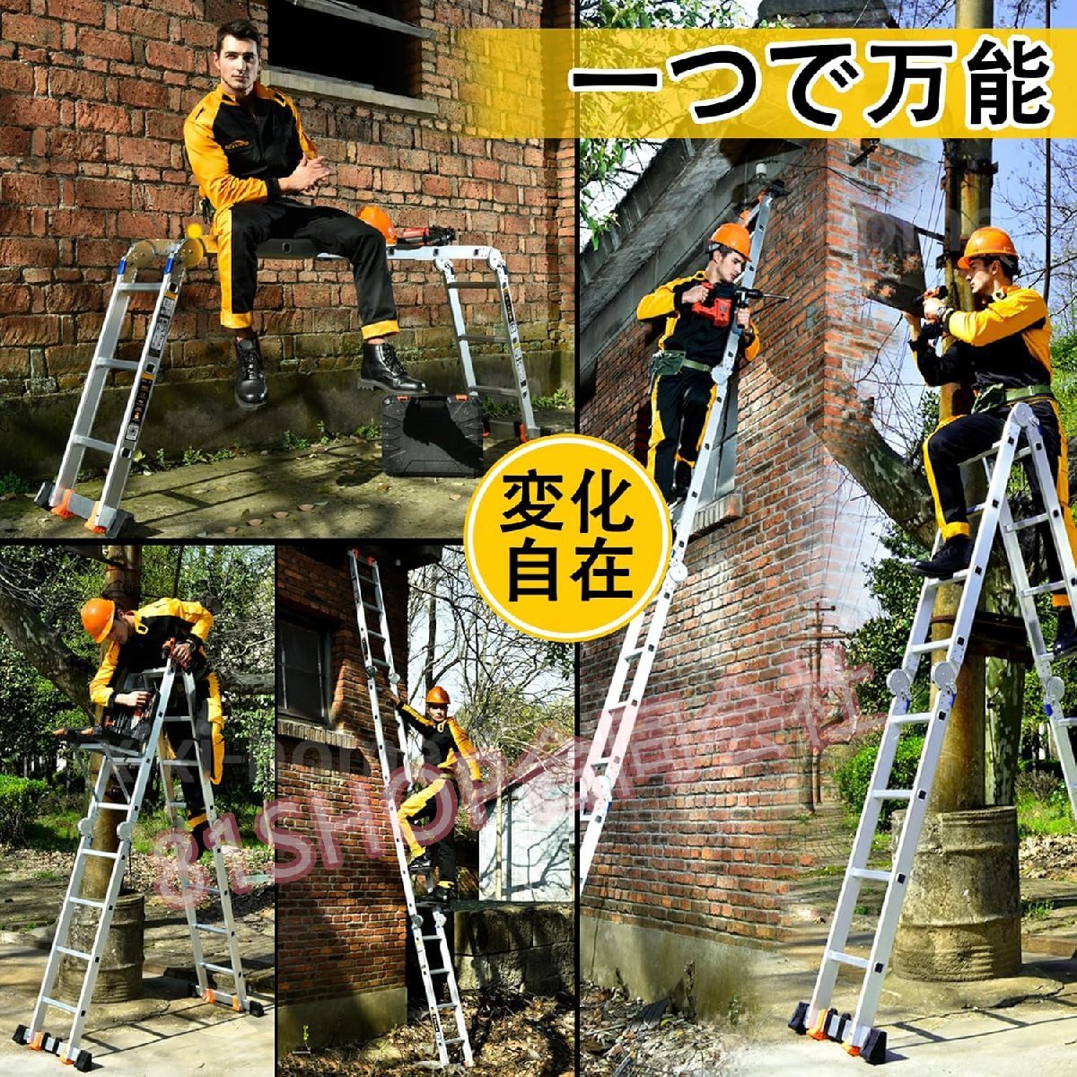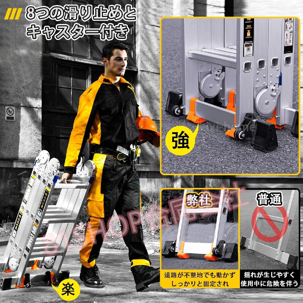 【多機能・自在変形・コンパクト収納】足場型、М字型、7字型、作業台型など、使用場所や作業内容に応じて形を自由に変えることができ、非常に便利です。高さは個別に調整できるため、高所作業や精密な作業も簡単にこなせます。階段作業にも対応しており、段差がある場所でも効率よく作業を進めることができます。