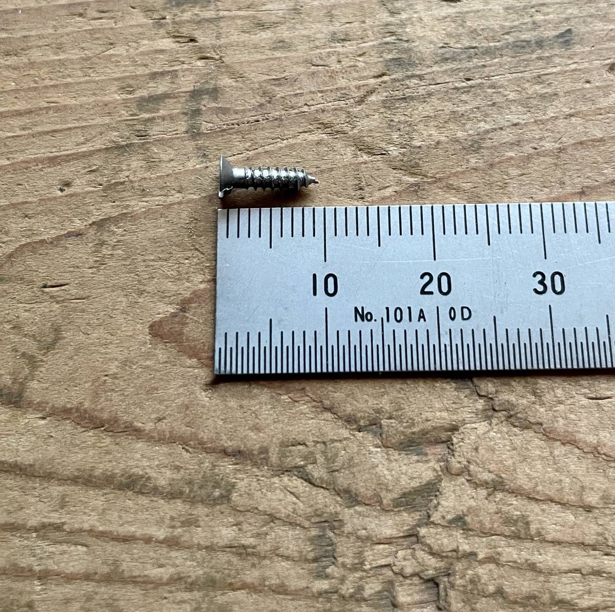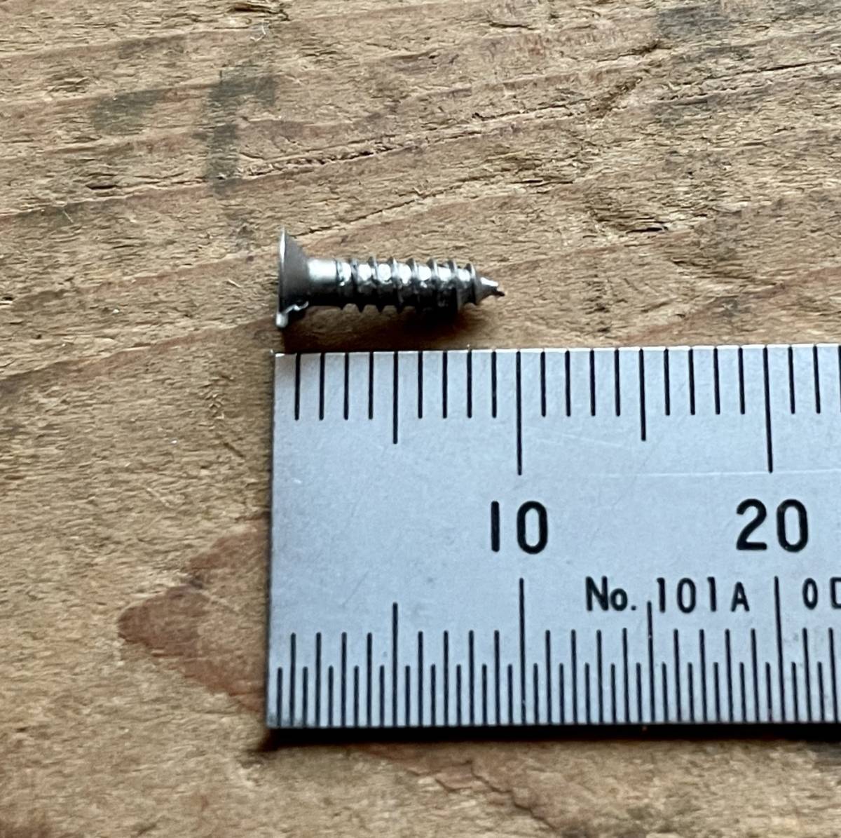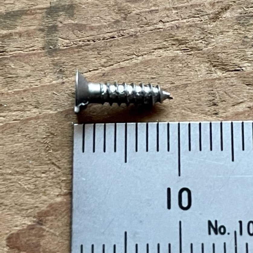 ・ネジ長さは約9.0ミリ。皿頭径は約4.3ミリ。ネジ部の太さは最大約2.2ミリです。