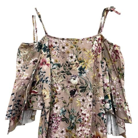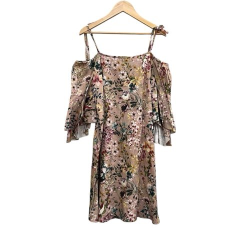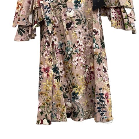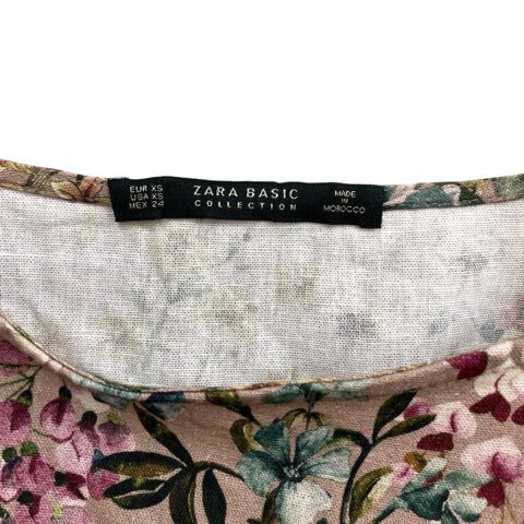 ザラ ベーシック ZARA BASIC タグ付き オフショルダーワンピース フレア 肩紐 花柄 リネン混 ピンク系 XS レディース