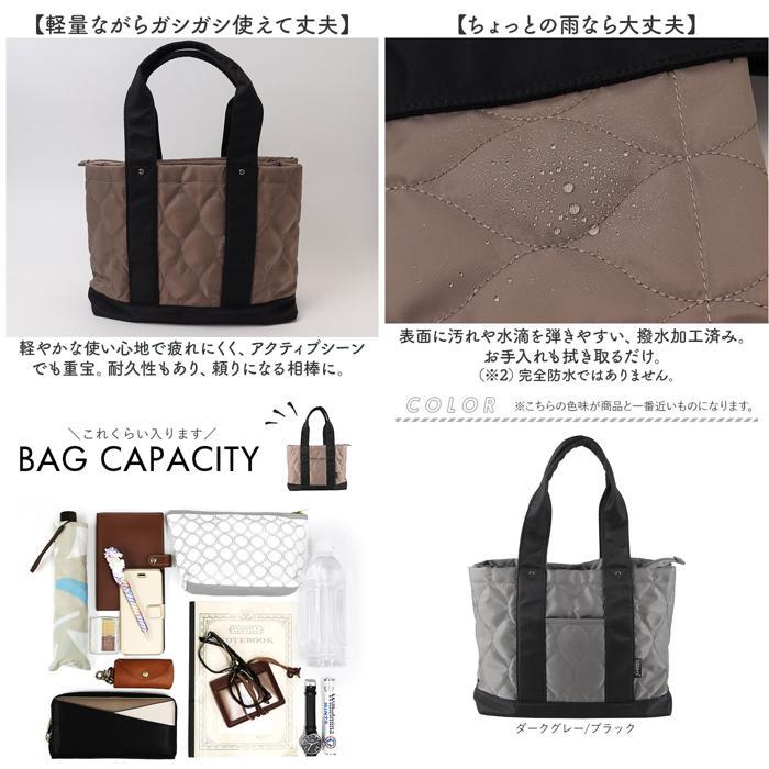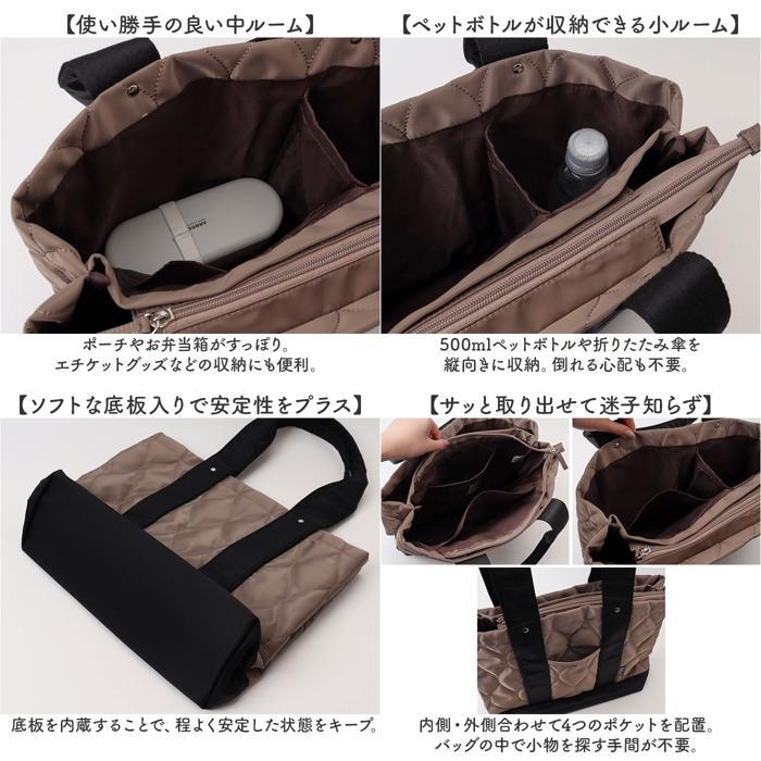 商品説明 | ・・【簡単に仕分けできて収納上手に♪】 ・仕切り&ポケットで使いやすさ抜群!「LIZDAYS キルティングナイロントートバッグ」。 ・【オン・オフ問わず使えて万能】 ・光沢のあるナイロン素材に、ふっくらキルティング。落ち着きのある仕上がりで、マルチに活躍。 ・【肩掛けできてストレスフリー】 ・ハンドルは厚手のアウターの上からでも、肩にも掛けられる長さに設計。両手が自由に! ・【仕分けしやすい3ルーム仕様】 ・仕切りを付けて、3つのスペースに。中身がひと目で確認できて、出し入れスムーズ。 ・(※1)横仕切りの中央部分は、底面に縫い付けられています。 ・【プライバシーを確保できて安心】 ・大ルームはA4サイズ対応。天ファスナー式で中身の飛び出しを防ぎ、セキュリティ面にも配慮。 ・【使い勝手の良い中ルーム】 ・ポーチやお弁当箱がすっぽり。エチケットグッズなどの収納にも便利。 ・【ペットボトルが収納できる小ルーム】 ・・500mlペットボトルや折りたたみ傘を縦向きに収納。倒れる心配も不要。 ・【ソフトな底板入りで安定性をプラス】 ・底板を内蔵することで、程よく安定した状態をキープ。 ・【サッと取り出せて迷子知らず】 ・内側・外側合わせて4つのポケットを配置。バッグの中で小物を探す手間が不要。 ・【軽量ながらガシガシ使えて丈夫】 ・軽やかな使い心地で疲れにくく、アクティブシーンでも重宝。耐久性もあり、頼りになる相棒に。 ・【ちょっとの雨なら大丈夫】 ・表面に汚れや水滴を弾きやすい、撥水加工済み。お手入れも拭き取るだけ。 ・(※2)完全防水ではありません。 ・【お気に入りを選べるカラー】 ・コーデを選ばないベーシックカラーをラインナップ。ブラックの部分使いも素敵にマッチ。 ・【ポケット仕様】 ・内側:オープンポケット×3 ・前面:オープンポケット×1 |