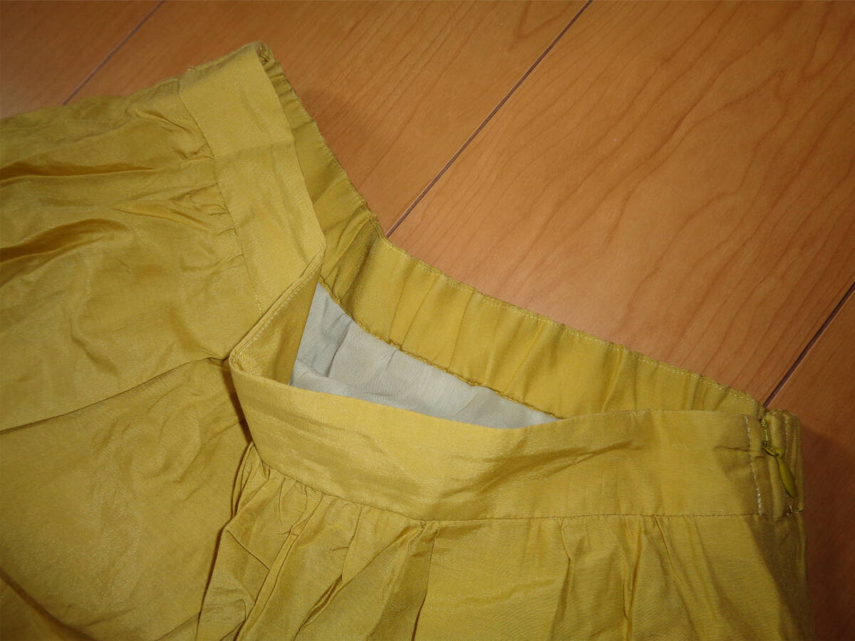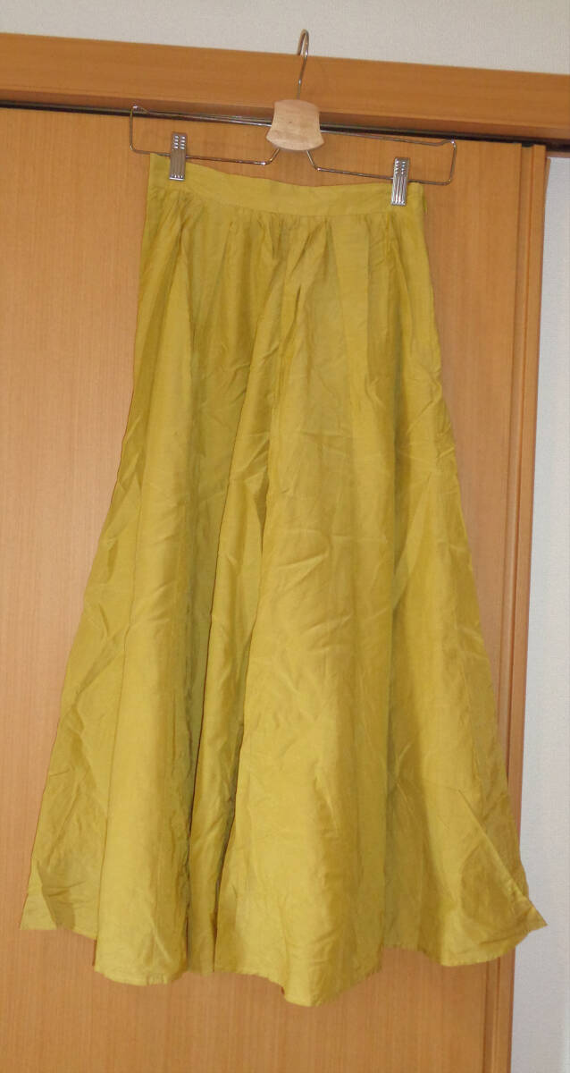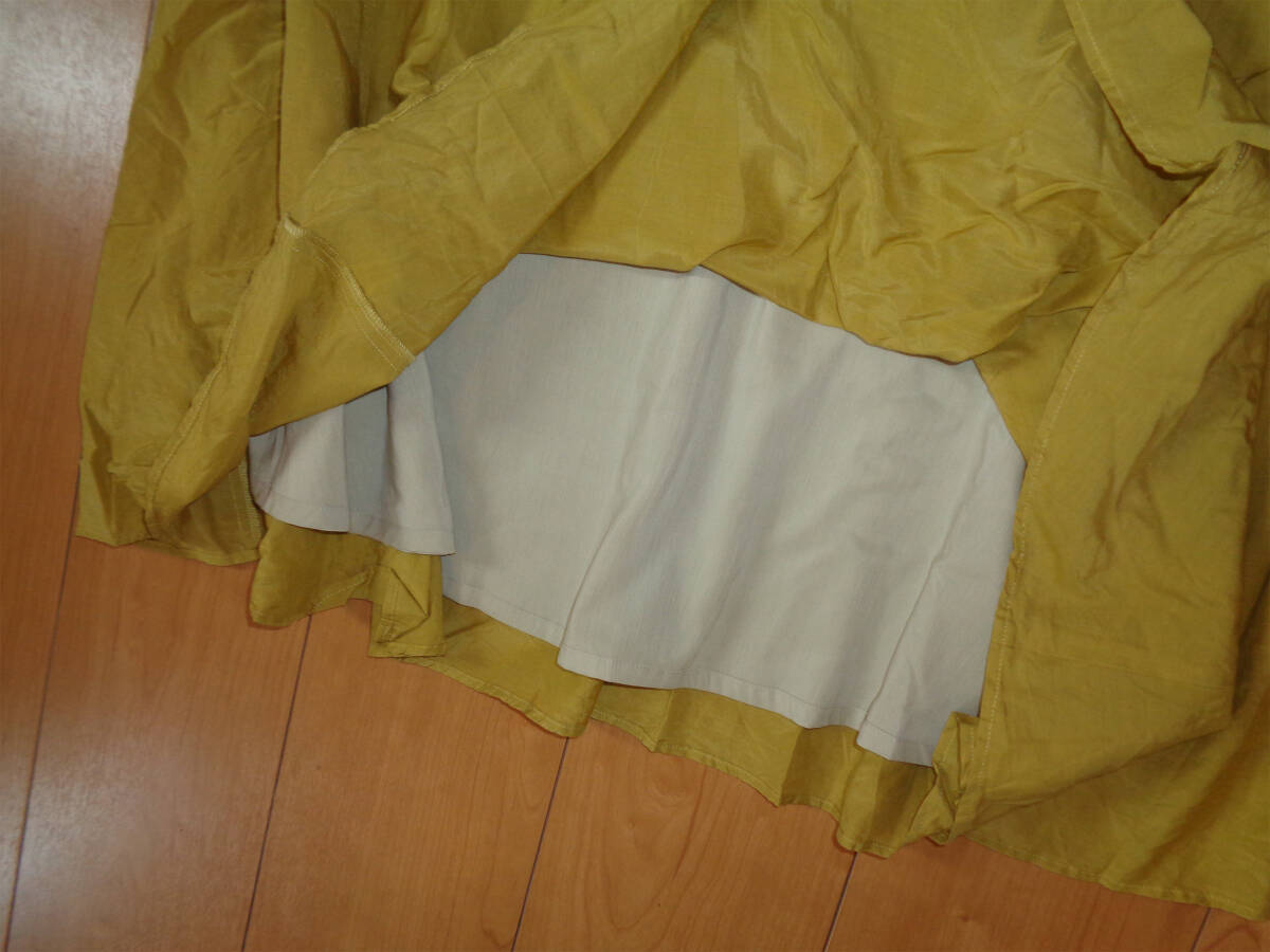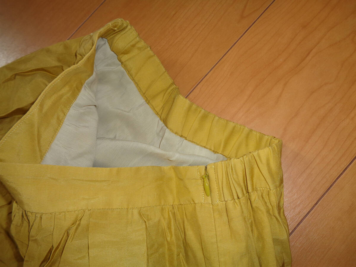 サイズは36でASHY ROVEのフレアスカートになります。裏地はついており、表側は辛子色で3枚目の色が一番近いです。軽やかな印象の商品です。ウエストはゴムが入ってます。