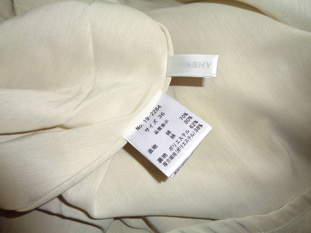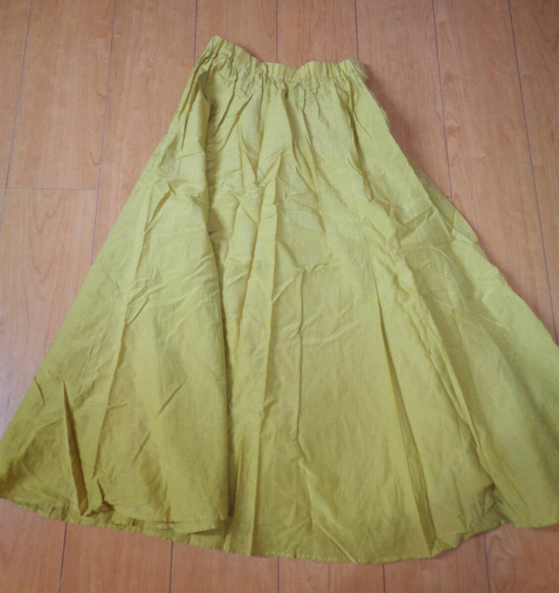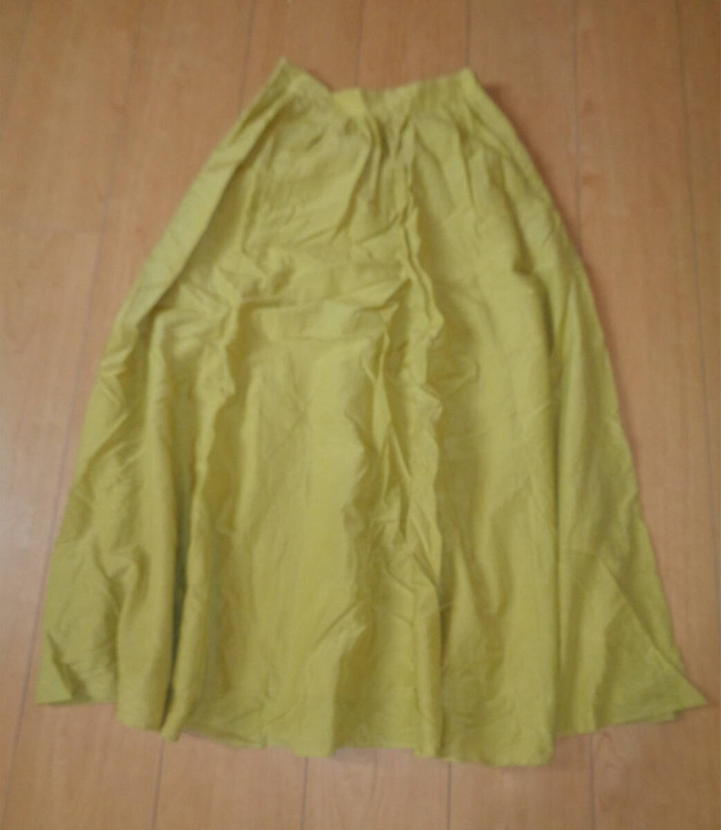 サイズは36でASHY ROVEのフレアスカートになります。裏地はついており、表側は辛子色で3枚目の色が一番近いです。軽やかな印象の商品です。ウエストはゴムが入ってます。