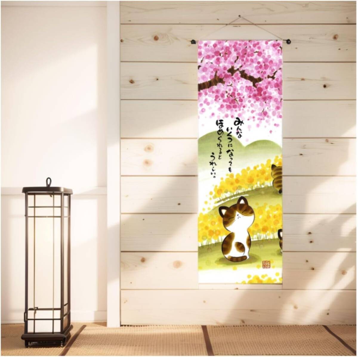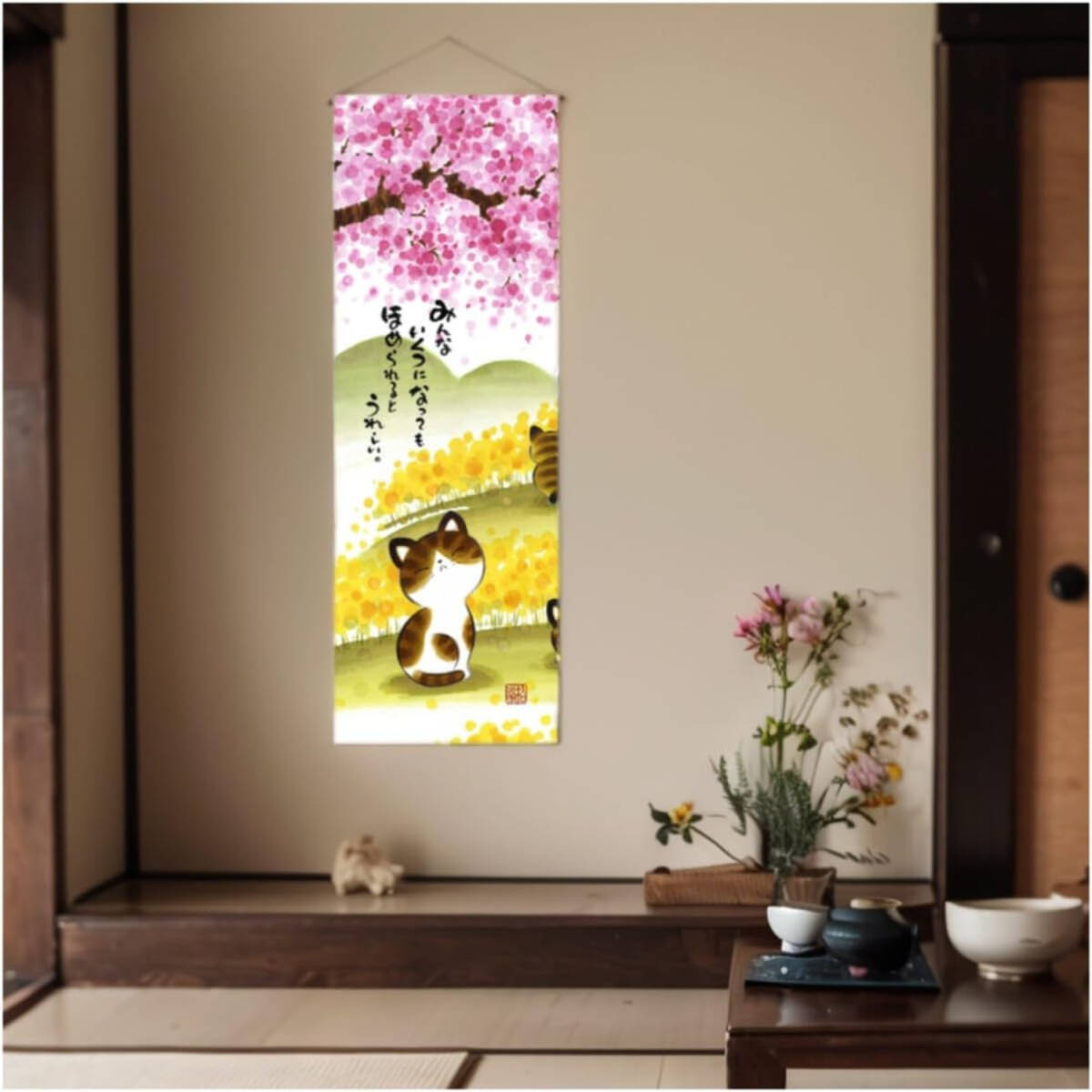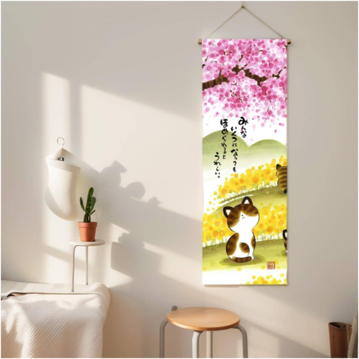 細タペストリー 花見猫ちゃん 120×40cm 和モダン 縦長 掛け軸 飾り付け インテリア ディスプレイ アート おしゃれ 模様替え