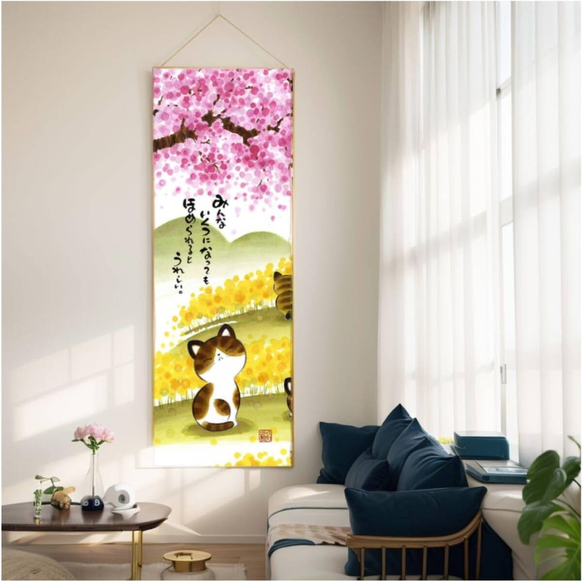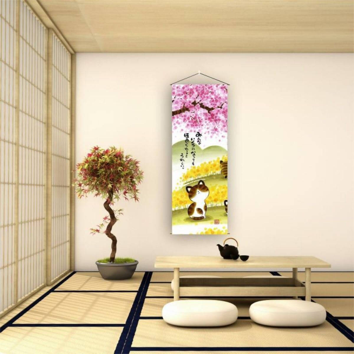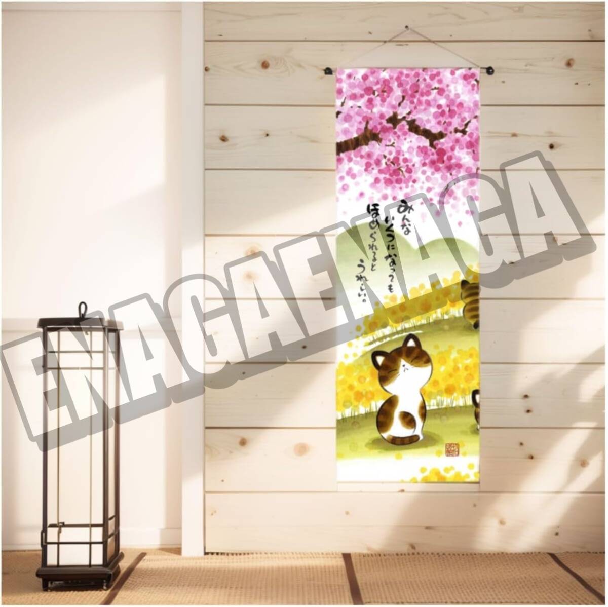 細タペストリー 花見猫ちゃん 120×40cm 和モダン 縦長 掛け軸 飾り付け インテリア ディスプレイ アート おしゃれ 模様替え