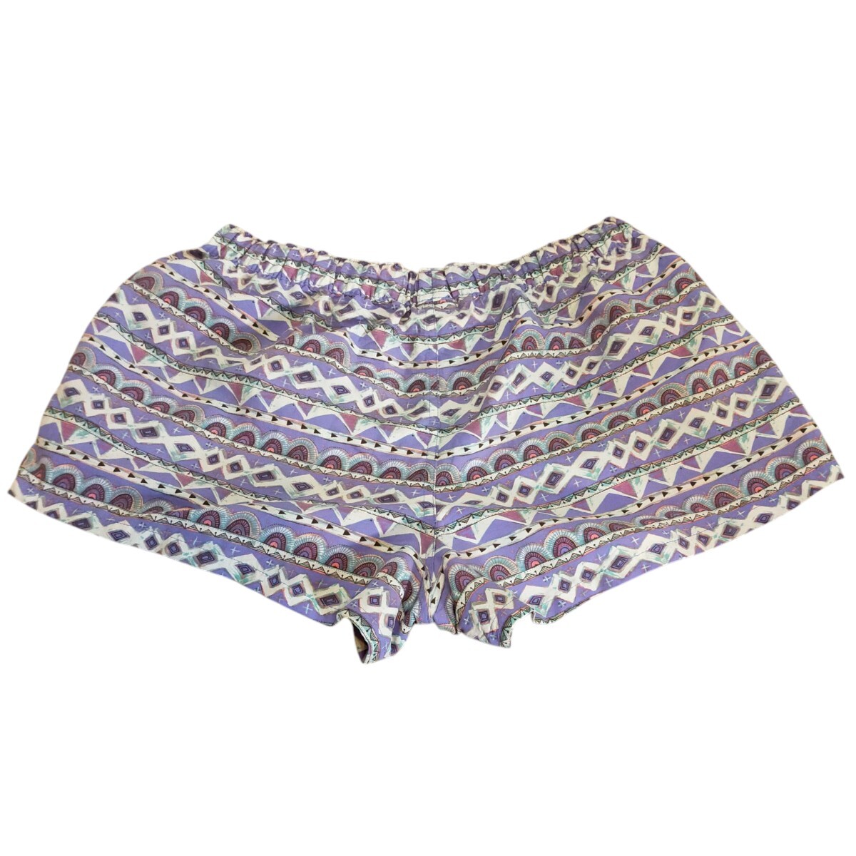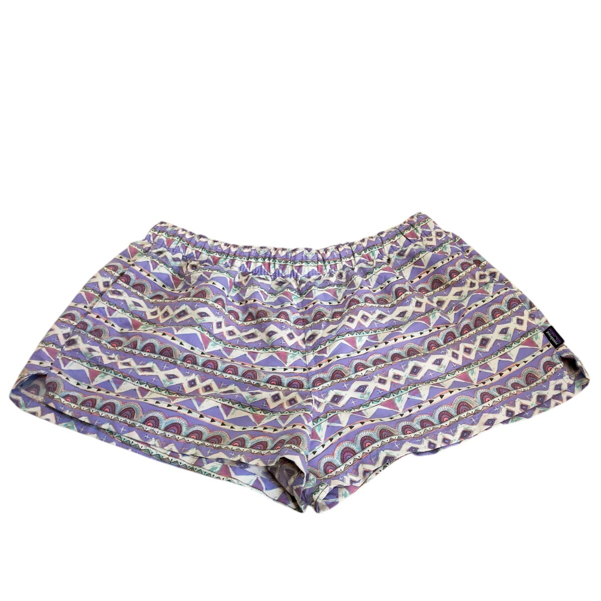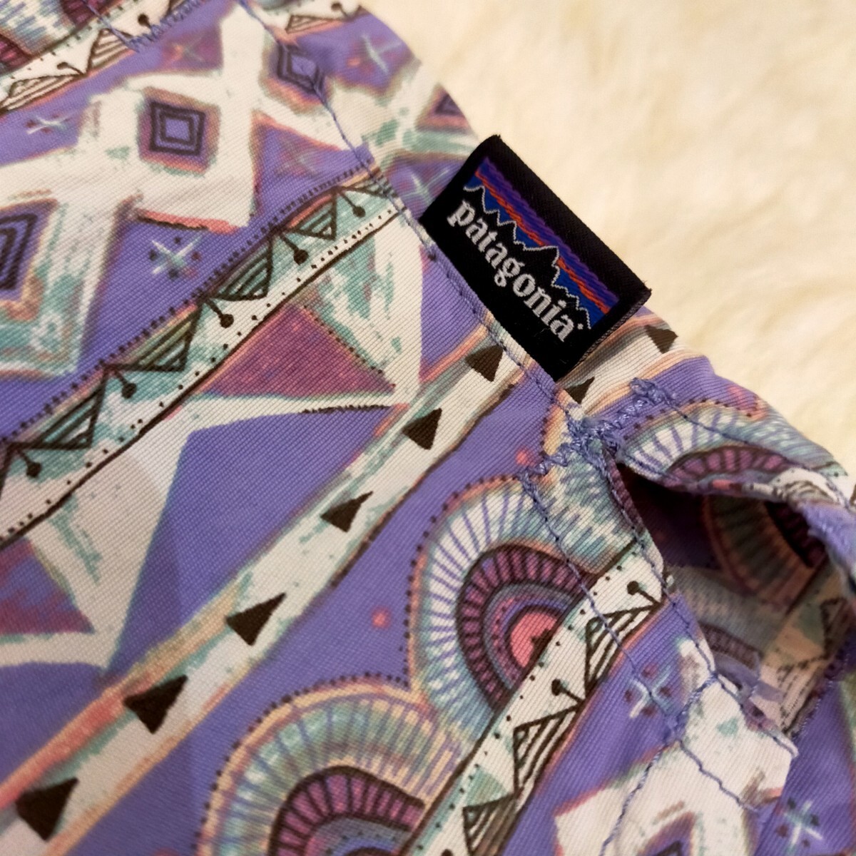 カラーは、パープル系にマルチカラーの総柄デザイン、股下の短いデザイン、リサイクルナイロン生地が使用されています。