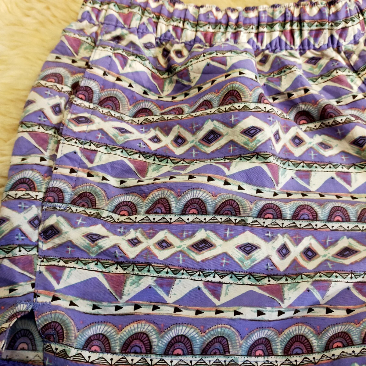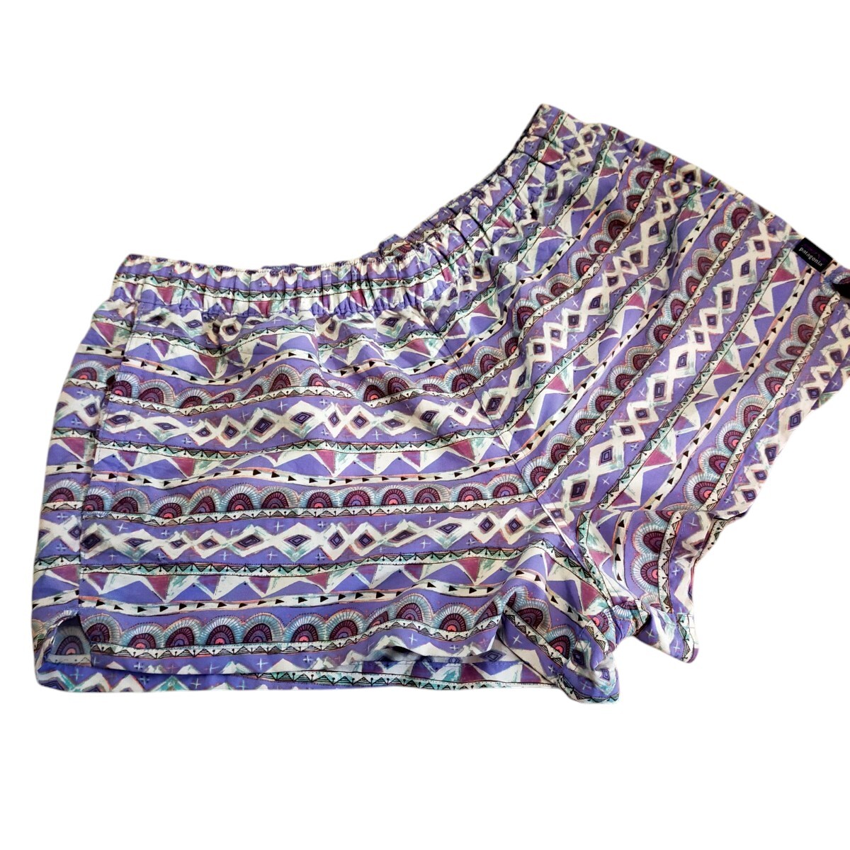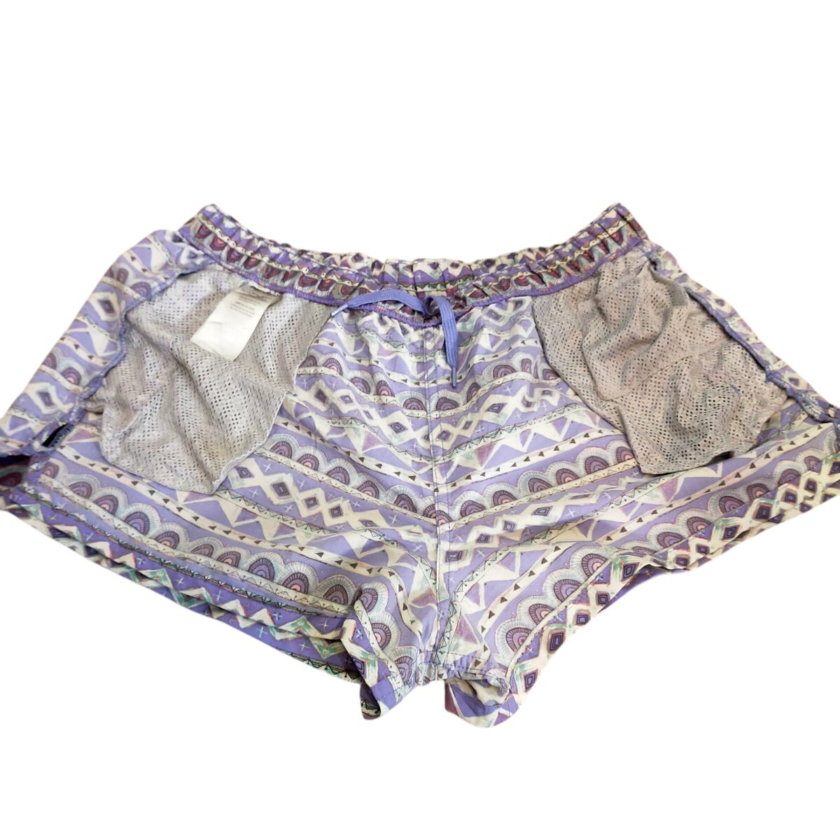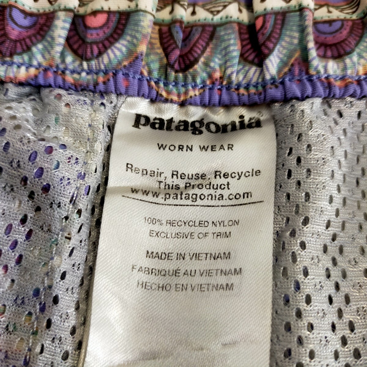 カラーは、パープル系にマルチカラーの総柄デザイン、股下の短いデザイン、リサイクルナイロン生地が使用されています。