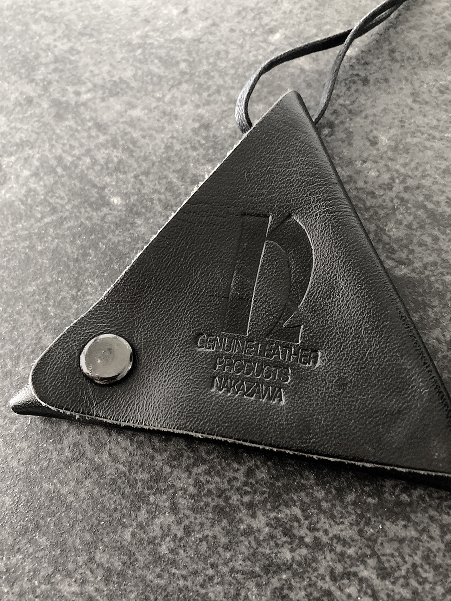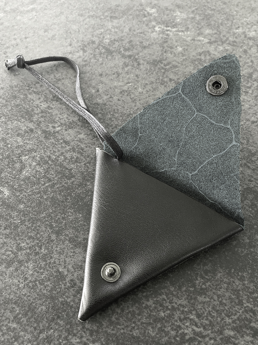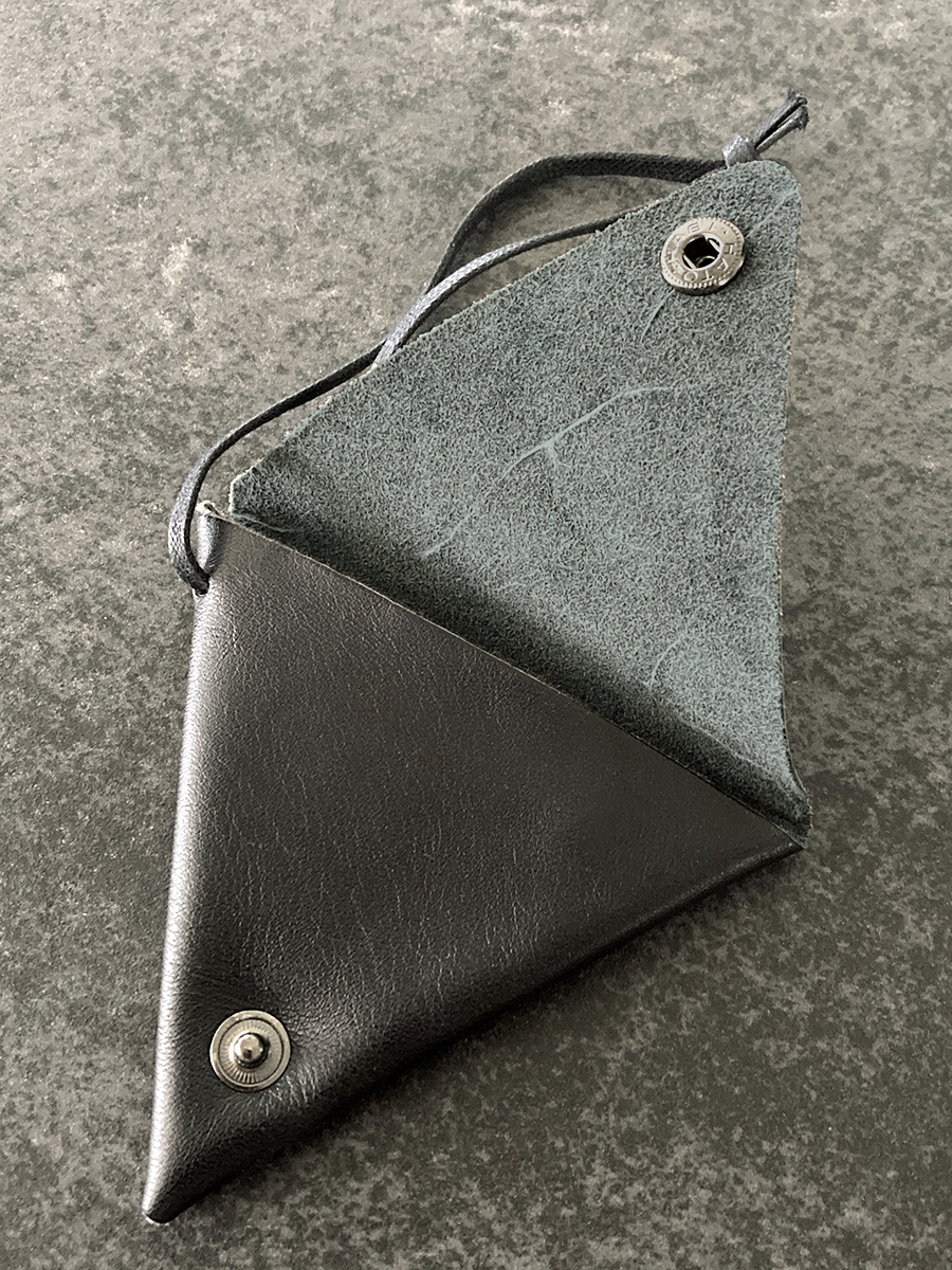 一枚の革を折りたたんだ作りで、スナップを二つとも外すと平らな状態になります。