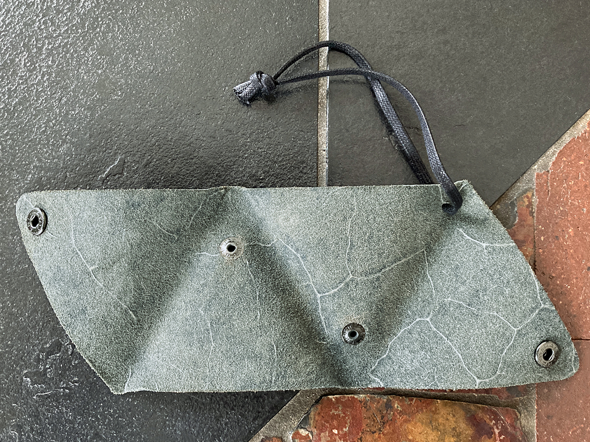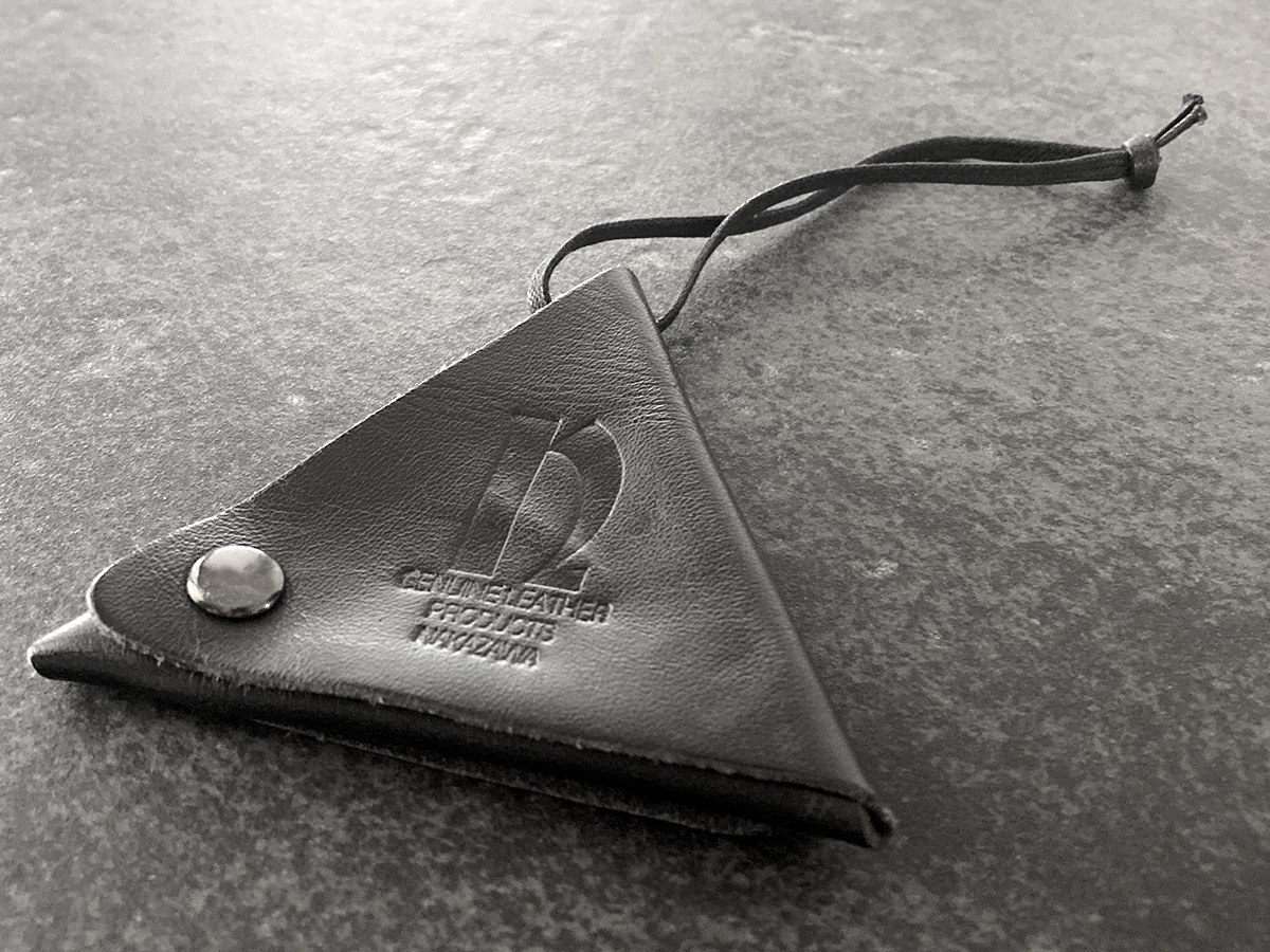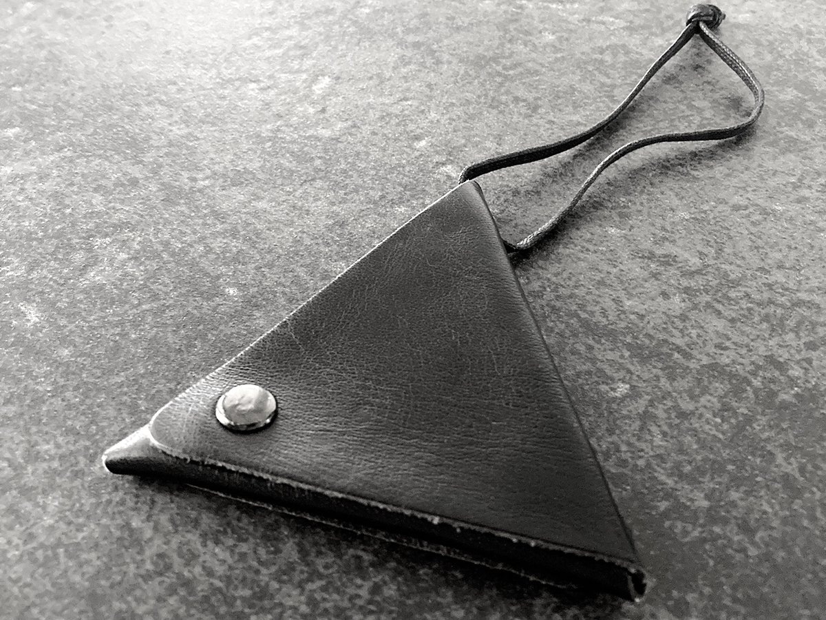 一枚の革を折りたたんだ作りで、スナップを二つとも外すと平らな状態になります。