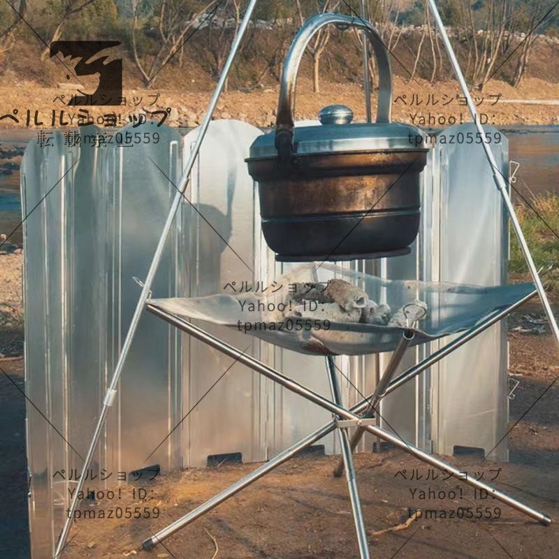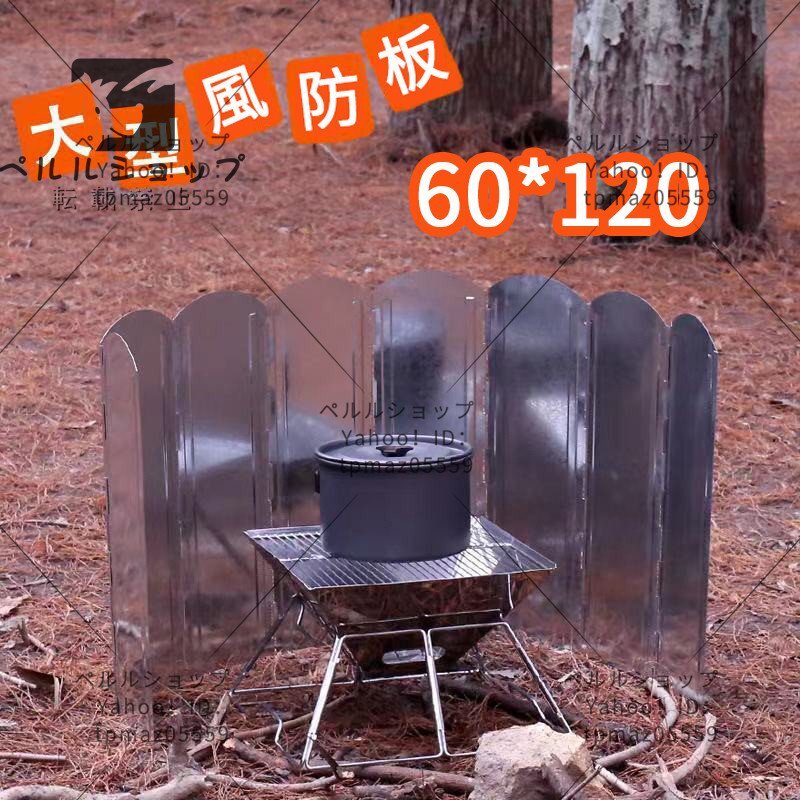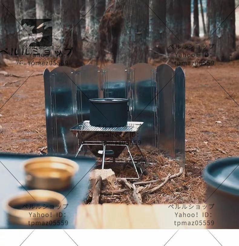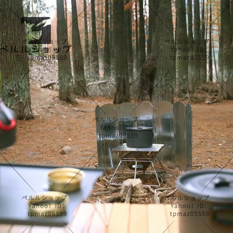 【8枚連結風除板】 8枚の亜鉛メッキ鋼板を連結させ、展開すると幅約120cmまで広がり、風や砂埃を徹底的にガードします。風が強いときが多い登山やキャンプなどアウトドアシーンで大活躍できるウインドスクリーン。調理をする際の火力を安定させ、火が揺れないので、料理