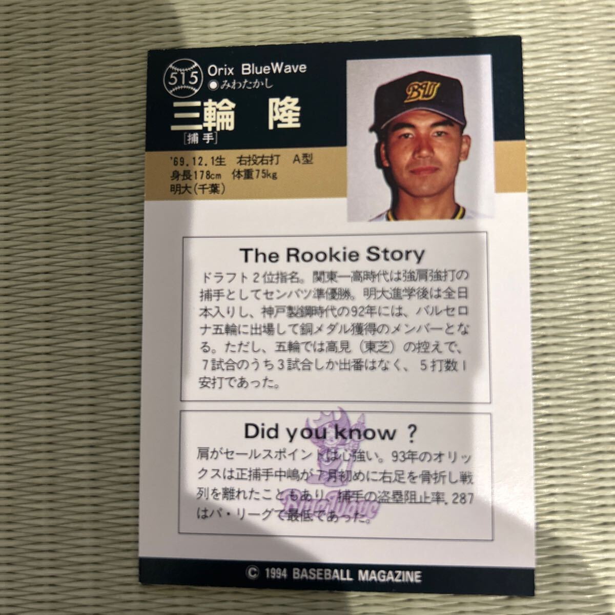 1994BBM 515 三輪隆 ルーキーカードRC オリックス