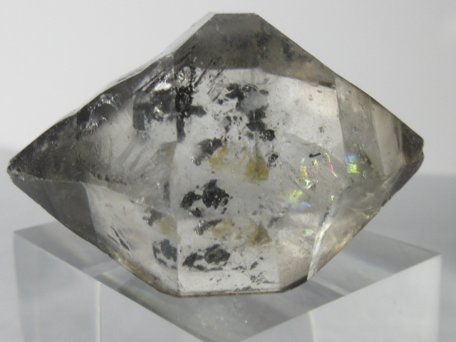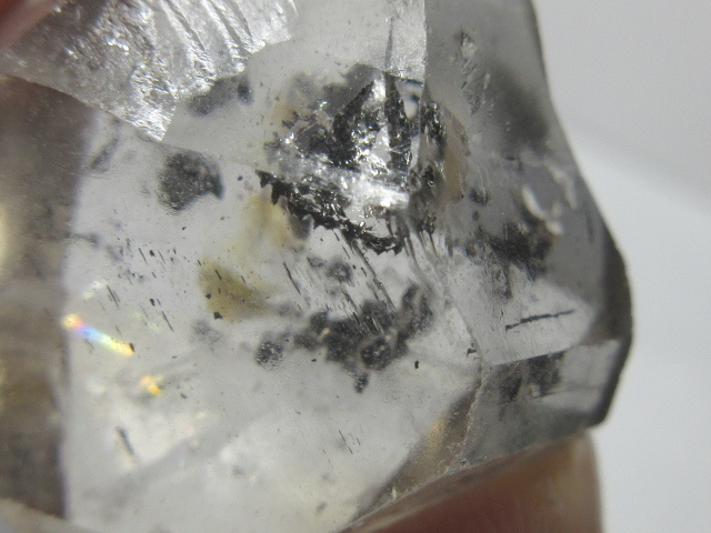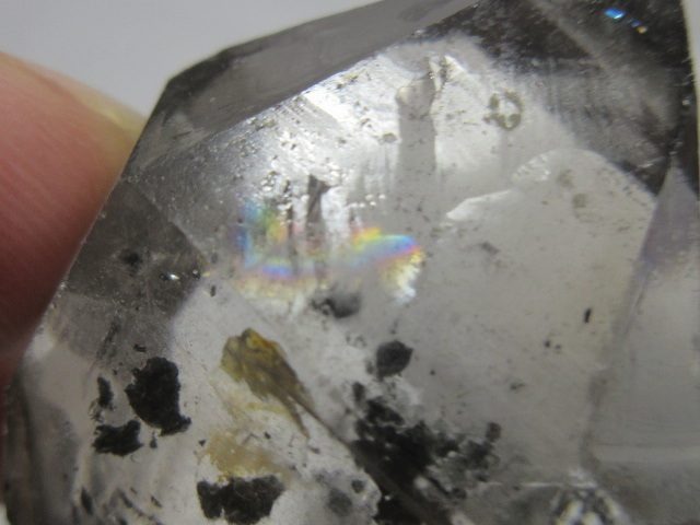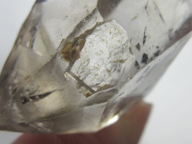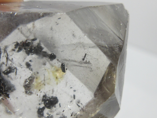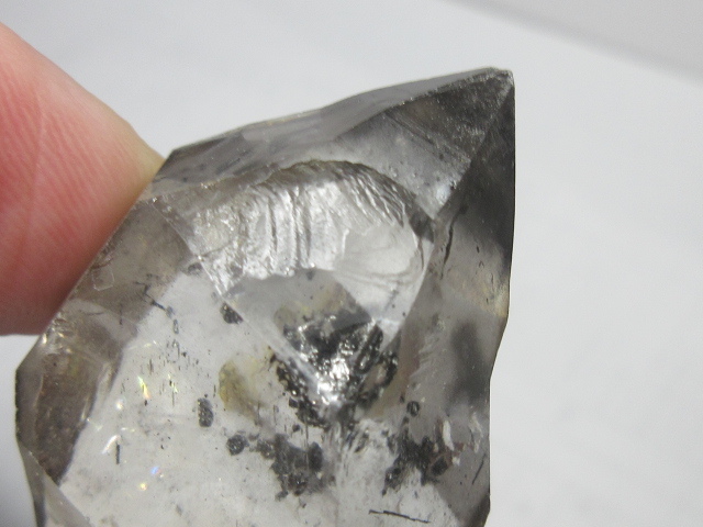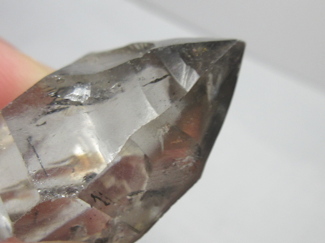 ・シチュアンでは珍しい形状の、ハーキマータイプ。 スモーキーがかった透明度の高い水晶、更に水晶内部に棒状の黒色鉱物が、また錐面の一部にはキー触像が見られます。