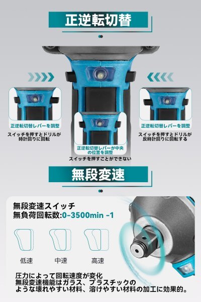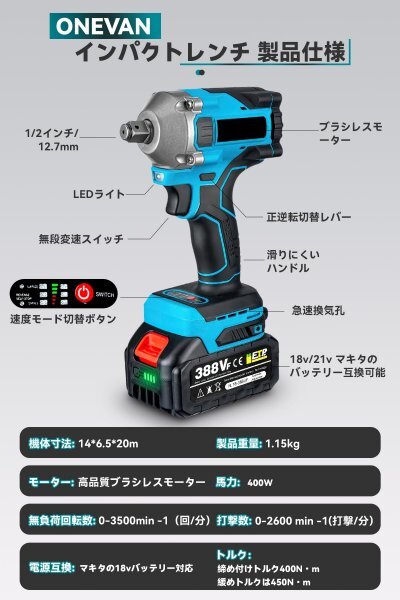 作業現場や家庭のメンテナンスで大活躍する『ONEVAN インパクトレンチ 18v』は、充電式で使い勝手が良く、圧倒的なパワーを誇る電動インパクトレンチです。最大700N・mの緩めトルクと630N・mの締め付けトルクを実現しており、タイヤ交換や大工仕事などの作業をスピーディーにこなせます。特に、正逆転切り替え機能と無段変速機能が搭載されているため、あらゆる作業に対応できる点が魅力です。初心者からプロまで、幅広い方にお使い頂ける商品です。