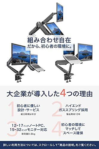 「SHOPPINGALL 時間は半分 カナダが愛した初心者用 モニターアーム ノートパソコン アーム 2画面 ディスプレイアーム デュアル ガ」▼4570047360130▼(商品説明)ブラック/-/-・Color:ブラック・? 大企業が続々導入 時間わずか25分 初心者用モニターアーム カナダ大手電力会社、通信会社、その他190社以上が導入している超初心者用モニターアーム。カナダで累計販売数10 800個突破。総売り上げ1.4億円達成。? 時間わずか25分 業界最短に匹敵 業界最短に匹敵する早さ。時間はわずか25分で済みます。アーム関節は最初から済みだから、箇所は最小限。? 安全 に迷わない 初心者向けの設計・サービス 安全でらくらく。モニター取付部の独自機能により、モニターを簡単取付。 .・? 時間わずか25分 業界最短に匹敵 業界最短に匹敵する早さ。時間はわずか25分で済みます。アーム関節は最初から済みだから、箇所は最小限。? 安全 に迷わない 初心者向けの設計・サービス 安全でらくらく。モニター取付部の独自機能により、モニターを簡単取付。工具は必要ありません 。 初心者向けサービス 迷うことなく、安