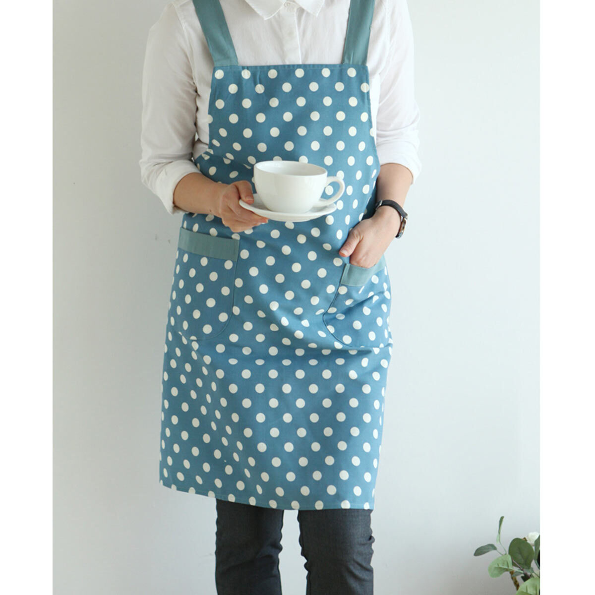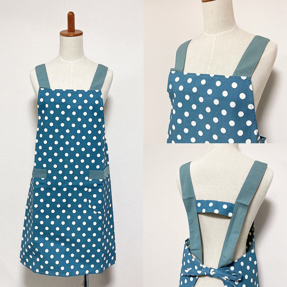 【訳あり・新品・未使用】エプロン レディース H型 おしゃれ かわいい ドット 水玉 ポケット付き ブルー 青