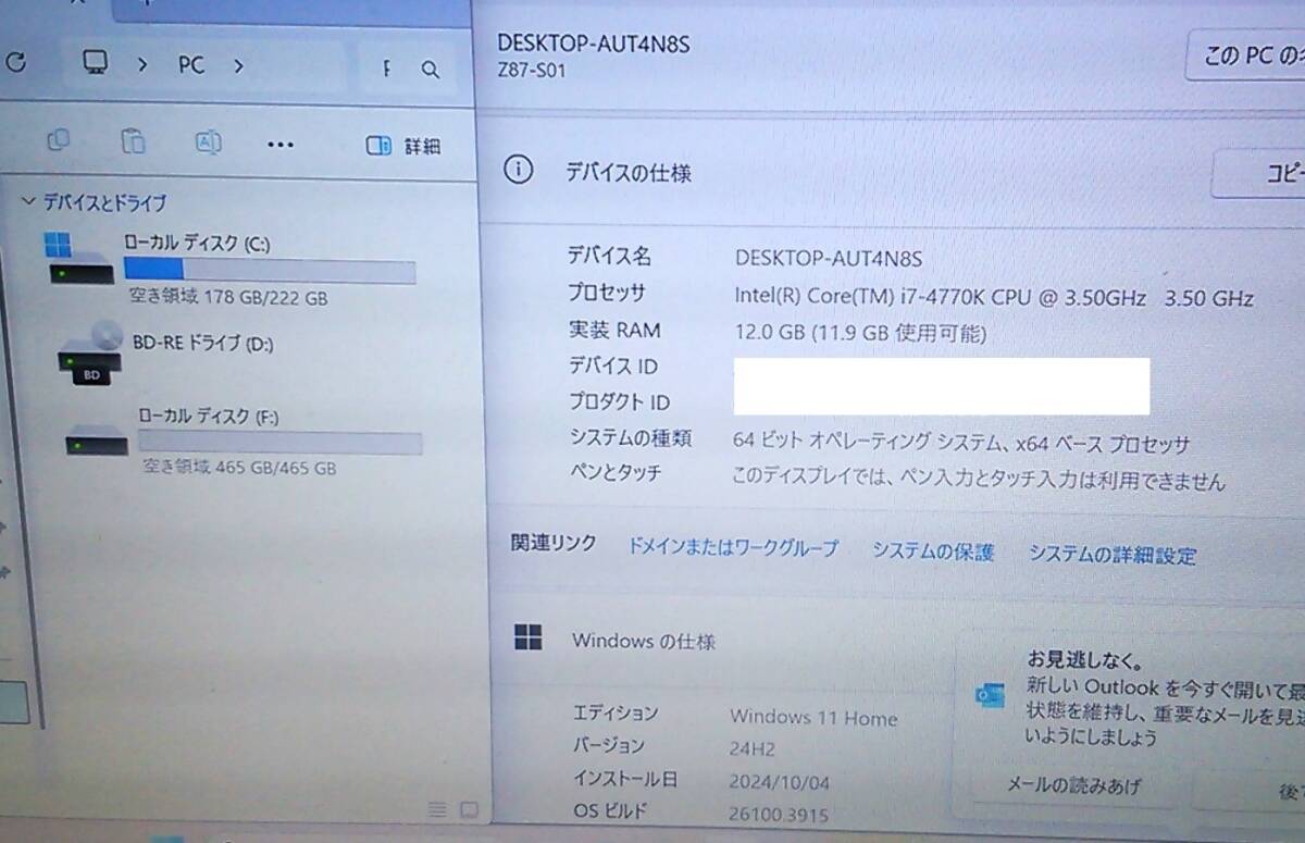 わかる範囲で CPU:COREi7-4770K   SSD240GB+HDD500GB   メモリー:12GB      グラボ:GeForce GTX750Ti    マザボ:MSI Z87-S01   80PLUS700W電源   ブルーレイドライブ       windows11(24H2)      OFFICE互換アプリ   TV視聴可(インターネットだけでTVが見られるようですが詳細は分かりません。 現在多くのTV番組が視聴可能ですが、アクセス殺到や規制?などで視聴は保証できませんのでご了承ください)   など      なお当方は専門知識は持ち合わせておりませんので、難しい質問はgoogleなどで検索ください。