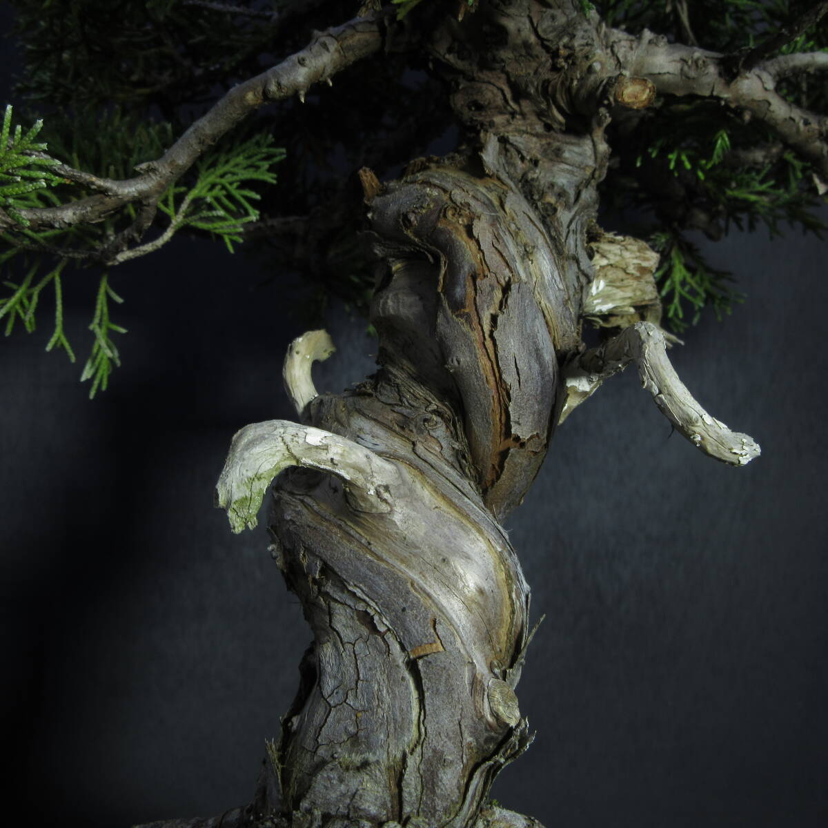 〇舎利と膨らみのついた水吸いによる景色ある幹芸が印象的なシンパクの盆栽、盆栽素材です。