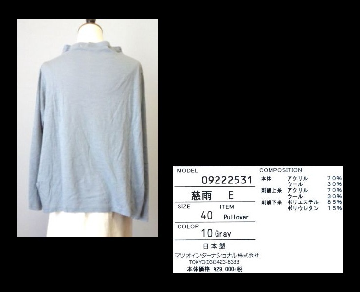 商品紹介 | ★表示サイズ…40 ★素材 本体…アクリル70% ウール30% 刺しゅう上糸…アクリル70% ウール30% 刺しゅう下糸…ポリエステル85% ポリウレタン15% ★日本製 ★マツオインターナショナル(株) ★お色…グレー ・刺しゅう入り ・重量…160g ・定価…29000円+税 ★実寸(多少の誤差はご了承ください) 肩幅:40.5㎝ 身幅:53㎝ 袖丈:57m 着丈:58㎝ ●土日祝日年末年始は発送できませんのでご了承ください。 ●画像の色合いは撮影環境、モニター環境により実物と若干異なる場合がございます。予めご了承ください。 まとめて取引は最初の落札から72時間が対象です。 最初の落札商品の取引ナビで同梱希望の旨をお知らせください |