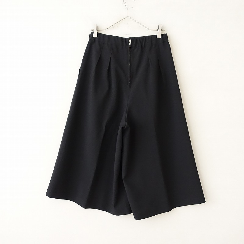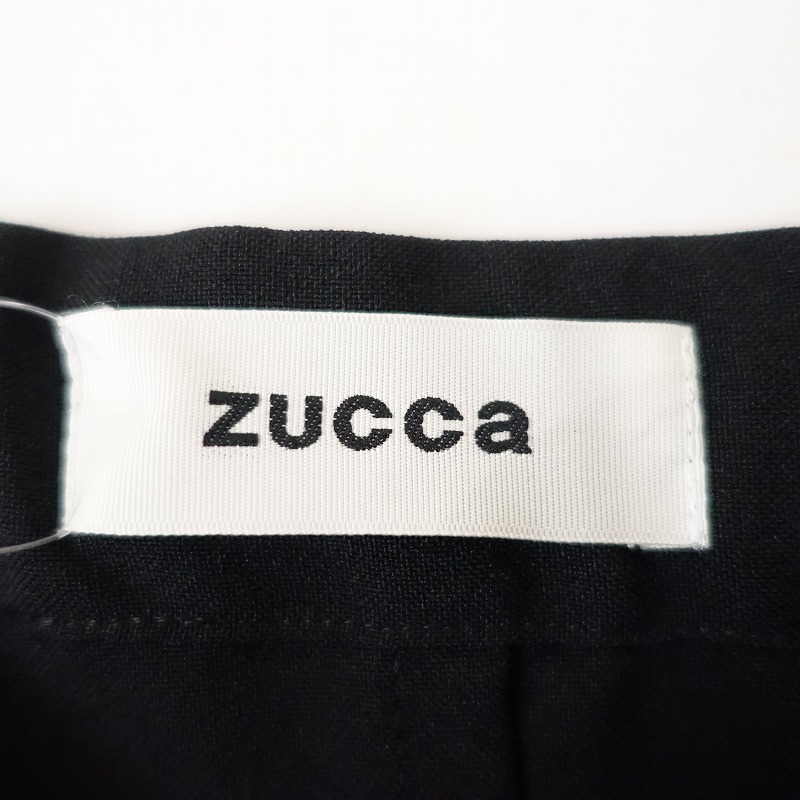 ZUCCAのフロントスリットクロップドワイドパンツです。カラーはブラックで、ドライな質感の生地で仕立てられております。ツータック入り、半端丈のワイドなシルエットになっており、バックウエストはゴム入りで、両腰の共布ベルト&ボタンにて2段階のサイズ調整が可能です。バック中央のファスナー開閉で着脱でき、フロント裾にスリット入り、両腰にポケットが付いております。 |