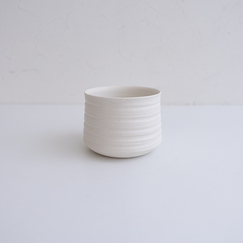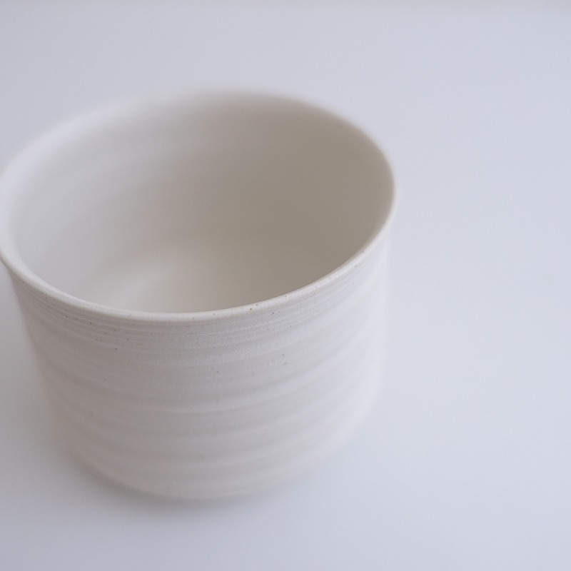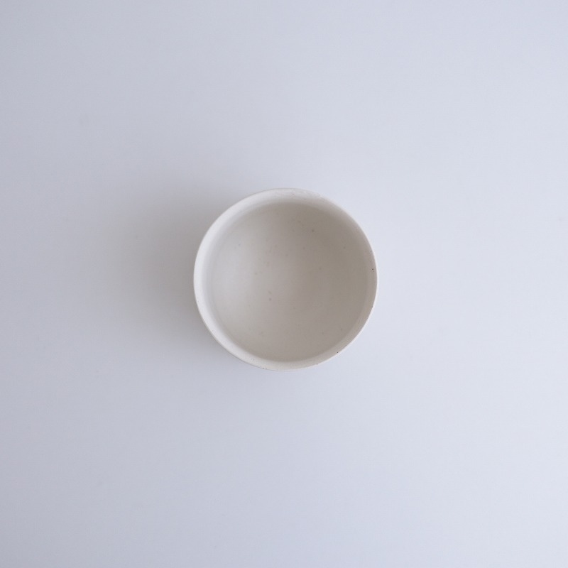 | 岡田直人さんのフリーカップ 7.5cmです。 カラーはホワイトで、所々に斑点混じりの風合いです。 器が作り出す陰影は、時に静寂に食卓の風景に映し出されます。 さりげなく残る「手仕事の匂い」。作品からはその世界観が感じられます。 |