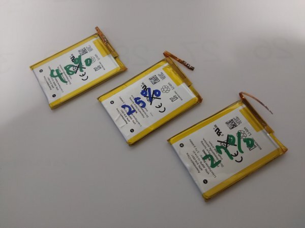 Apple iPod touch (第 4 世代) にて使用しておりました、中古バッテリーになります。それぞれ、バッテリー容量は25% 27% 48% です。容量は、動画再生にて何分再生可能かをもとに実証した数値になります。目安とお考えください。