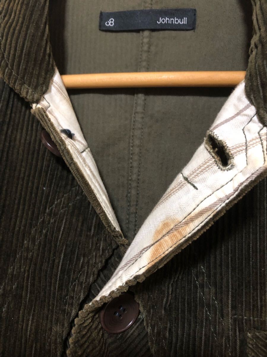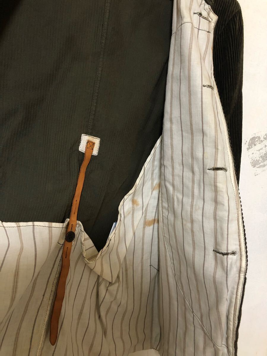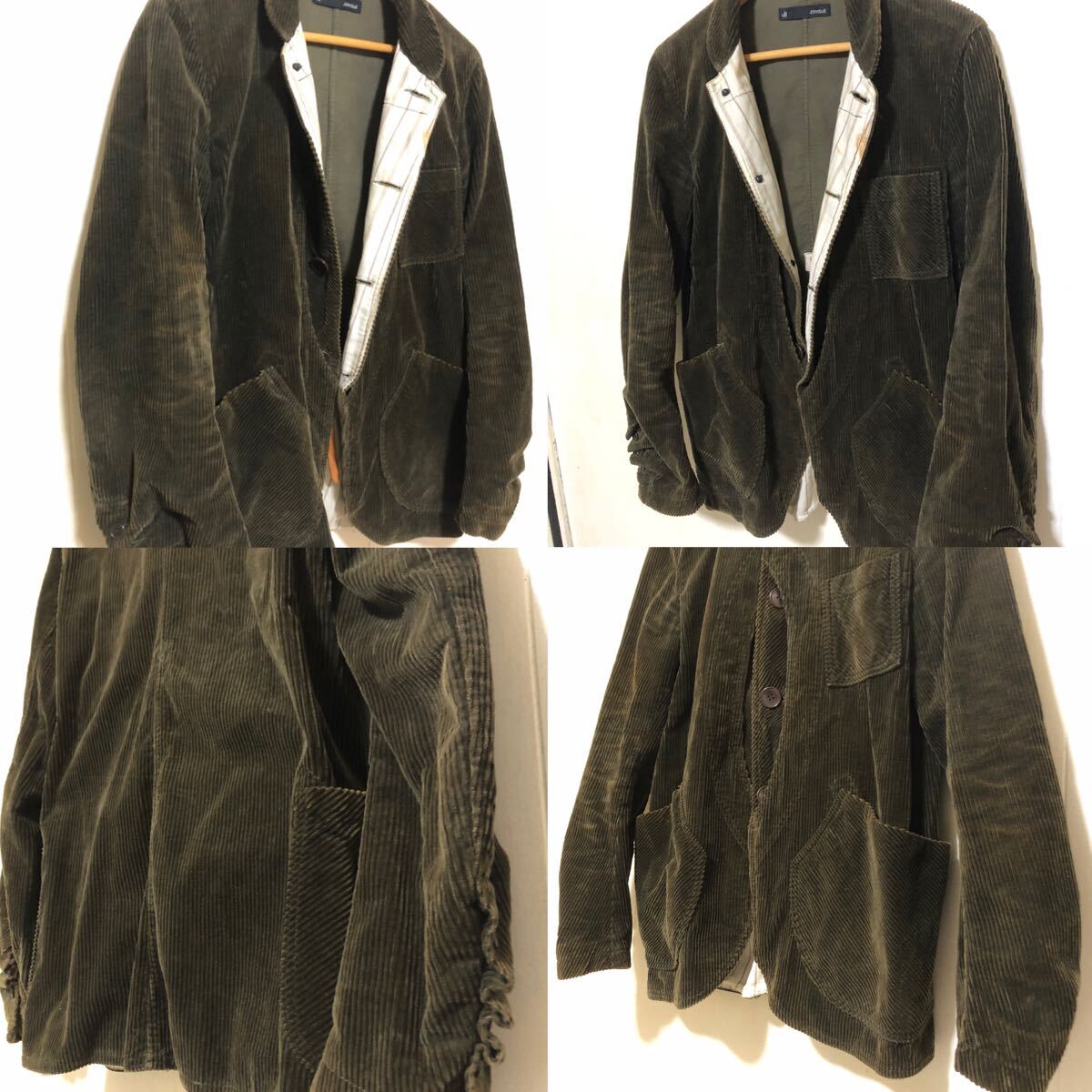 緑とダークブラウンの中間のような、光の加減で独特の表情を見せる太畝コーデュロイジャケット