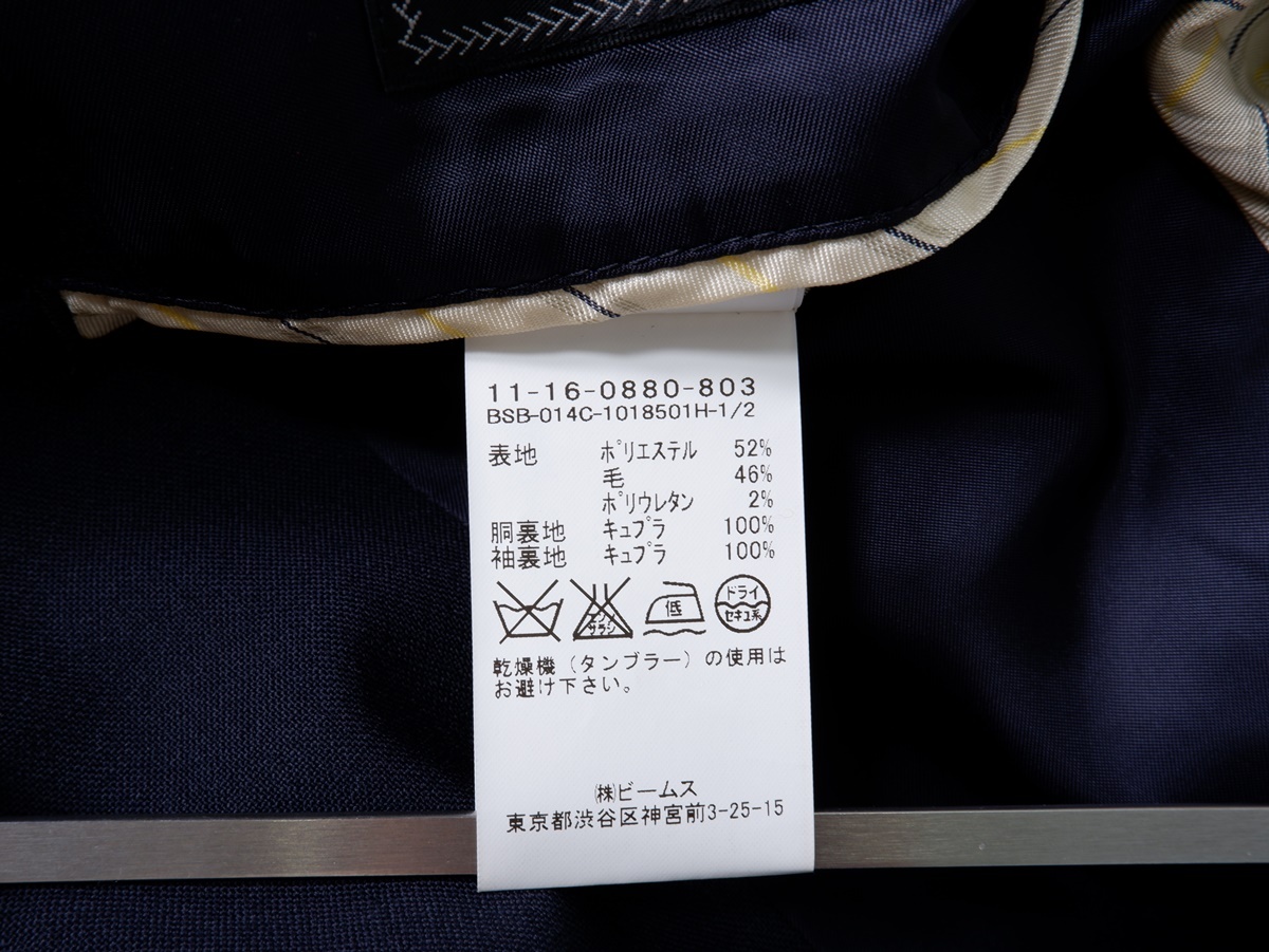 ポリエステル52%毛46%ポリウレタン2% 胴裏地キュプラ 100% 袖裏地:キュプラ100% |
