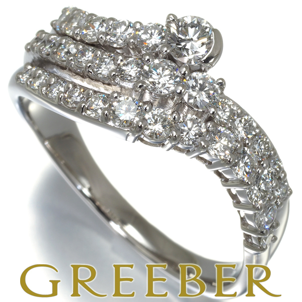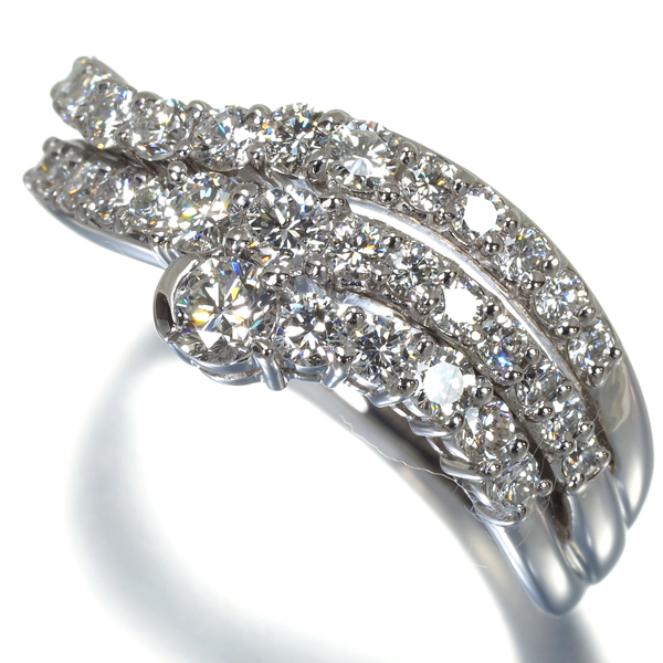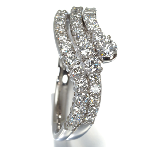 上質ダイヤをセレクトした美しいウェーブデザインリング。3ラインを描く上品なラインから眩く煌びやかな輝きが溢れる高級ジュエリーですよ。 |
