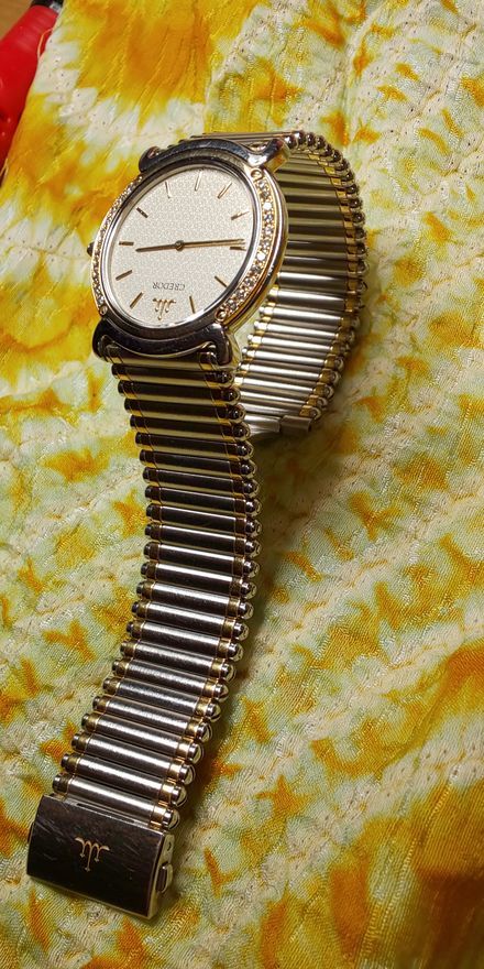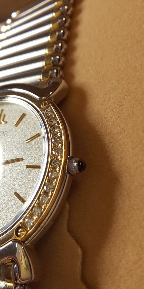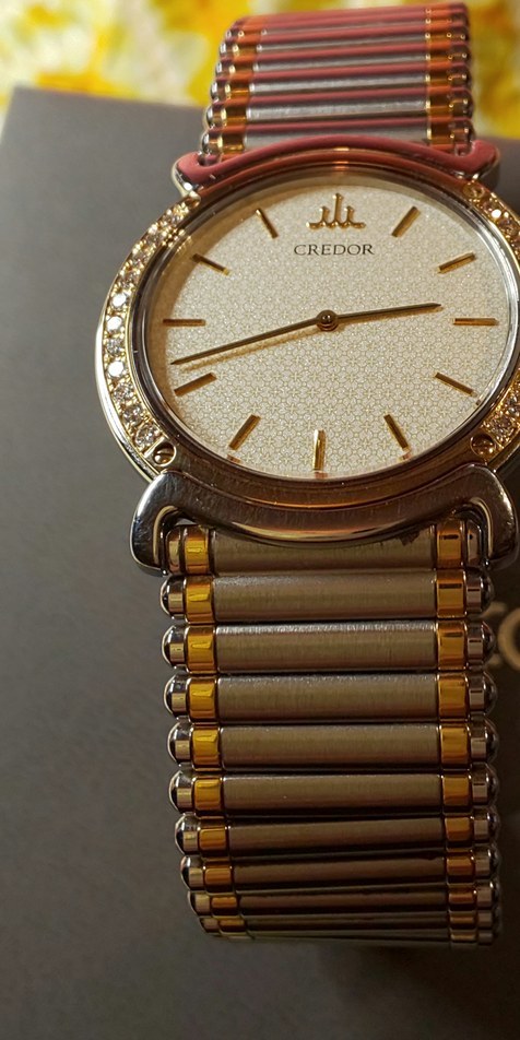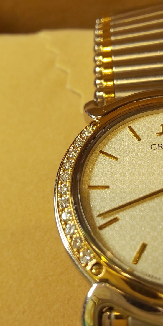 珍しいメンズのクレドール18Kベゼルにダイヤセッッティングの超豪華きれいなリネアクレバです。機械は5A74-0190 18KT BEZELの表記があります。ダイヤルの径は約31mm、リューズこみで33mm、たても33mmくらいです。ブレスも緩みのないずっしりとしたステンレスで約18.5CMくらいの長さになります。素人測定なので多少の誤差はお許しください。ベゼル ダイヤともにすごくきれいで、メンズのダイヤベゼルは特に希少です。細かい傷はありますが、ほとんど気にならない程度だと思いますが、気にされる方はご遠慮ください。順調に稼働しており手がかかりませんが、あくまで新品ではありませんのでNC.NR.でお願いいたします。セイコーのきれいな箱に入れて送料無料で送ります。よろしくお願いいたします。