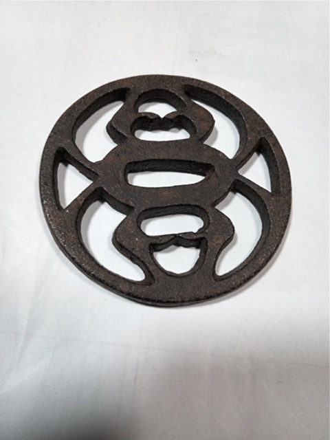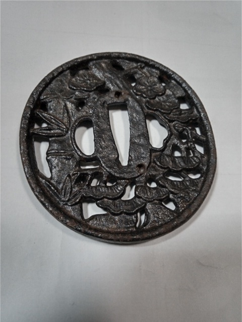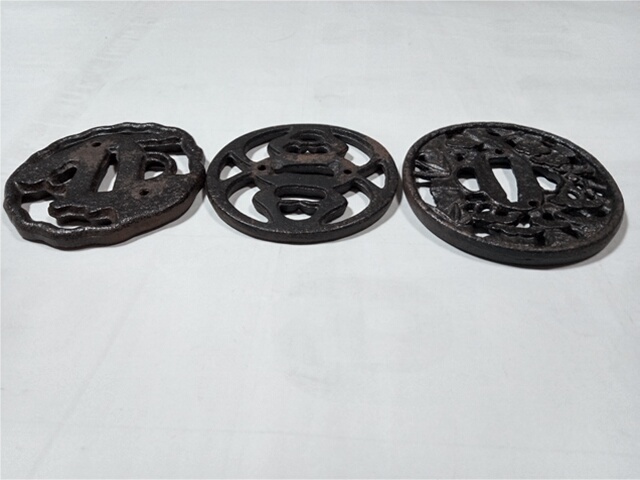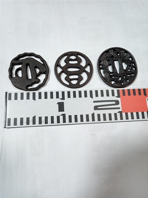 | 刀の鍔3個の出品です。 飾用の刀の鍔です。 経年の擦れ、小キズ、錆付等等ございます。 画像をよくご覧の上、入札をお願いいたします。 ※画像のメジャは、サイズ確認用です。売り物ではございません。 送料 レターパックプラス600円もしくはゆうパック60サイズ ーーーーーーーーーーーーーーーーーーーーーーーーーーーーーーーーーー | |||
