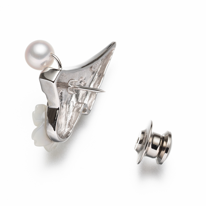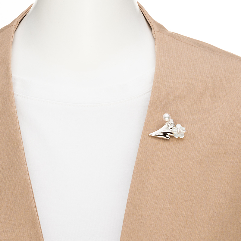 6.5mmのアコヤパールをあしらい、シェルで桜の花を、シルバーで富士山を表現した、日本の美を象徴するピンブローチ。