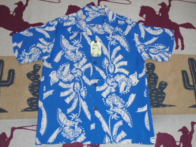 ハワイにおいて古くから自生していたハニーサックル(スイカズラ科の植物)とバナナリーフで構成されたボーダー・パターンの一枚。ヴィンテージアロハシャツの中でもハニーサックルがモチーフとして使われているデザインは非常に珍しい。この作品を手がけた「マキナニー」は1850年創業の高級衣料専門店。1942年にはホノルルのダウンタウンにスポーツウエア専門店を開店し、水着などとともに本格的にアロハシャツの取り扱いを始めた。