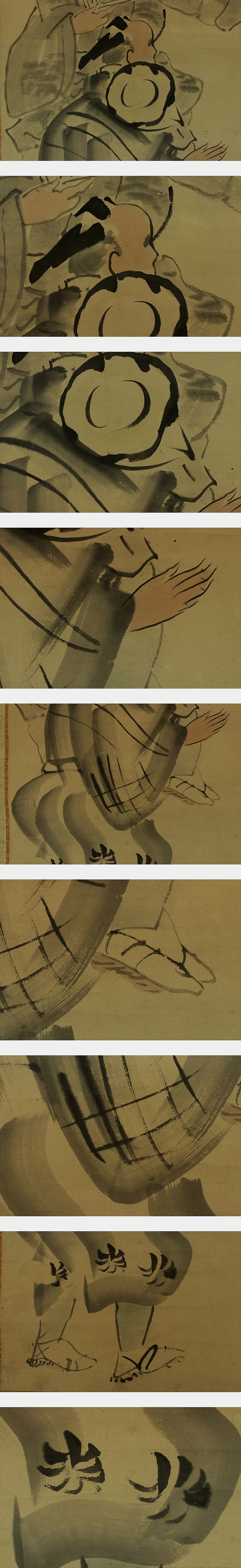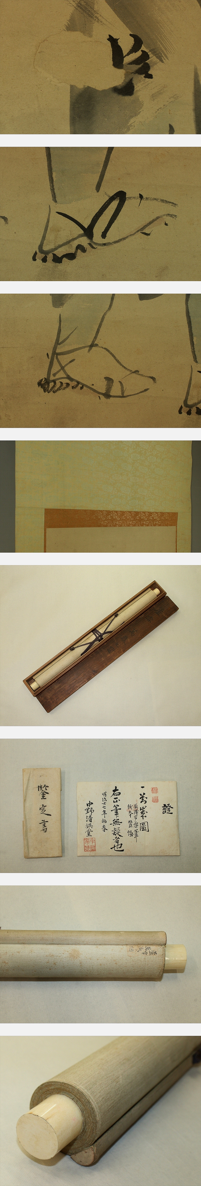 長沢芦雪 ながさわ-ろせつ(1754-1799) 江戸時代の絵師。 円山応挙の高弟。長沢蘆雪、長澤蘆雪とも表記される。 名は、政勝、魚。字は氷計、引裾。通称、主計。芦雪の他、別号に千洲漁者、千緝なども用いた。 円山応挙の弟子で、師とは対照的に、大胆な構図、斬新なクローズアップを用い、 奇抜で機知に富んだ画風を展開した「奇想の絵師」の一人。 本紙は、染み、汚れ、強めの折れ、皺、擦れ、虫食、生地の欠損があります。 表装は、染み、汚れ、折れ、皺、虫食、破れ、ほつれ、軸先に汚れがあります。 【サイズ】 作品 横約48cm×縦約130cm 表装 横約63cm×縦約191cm |