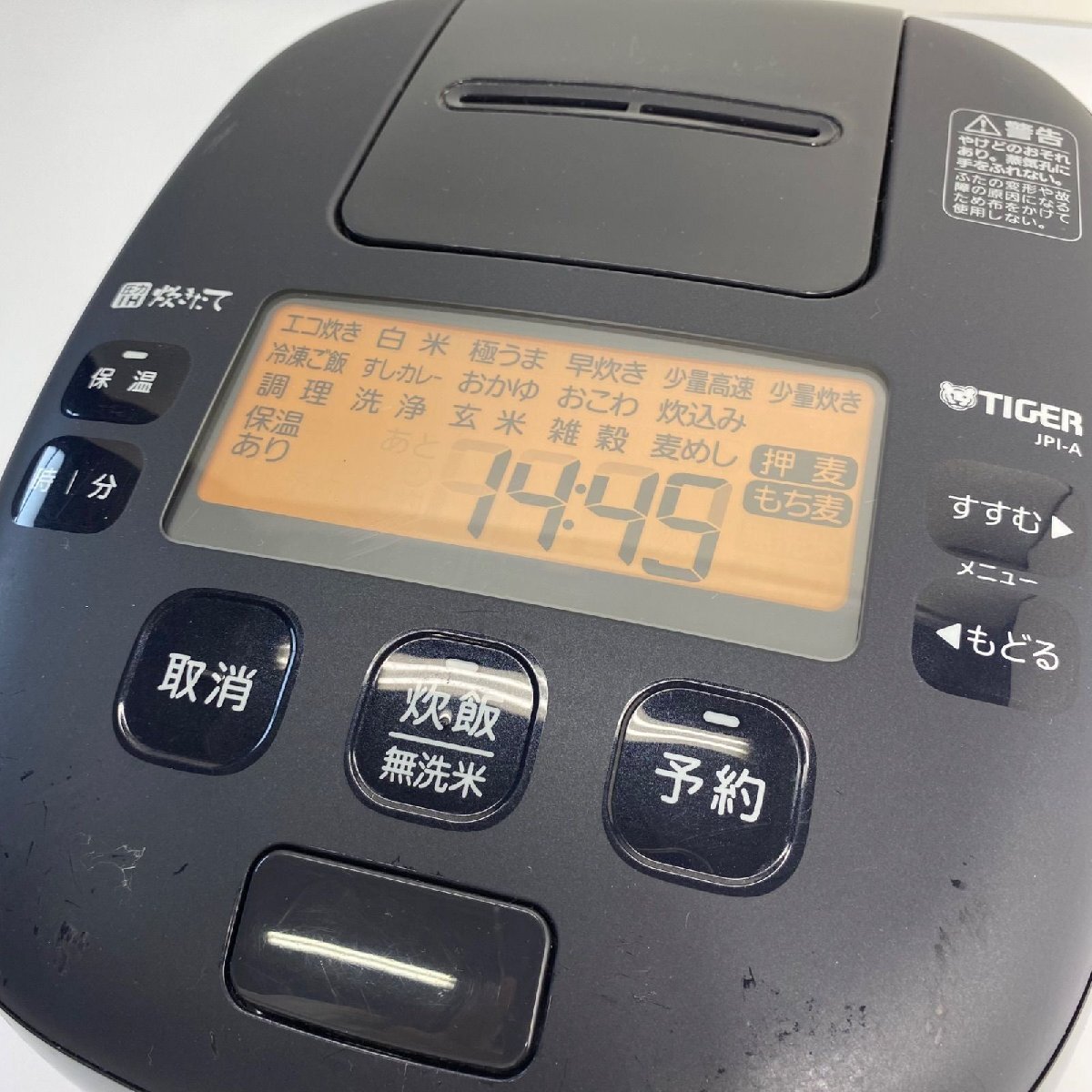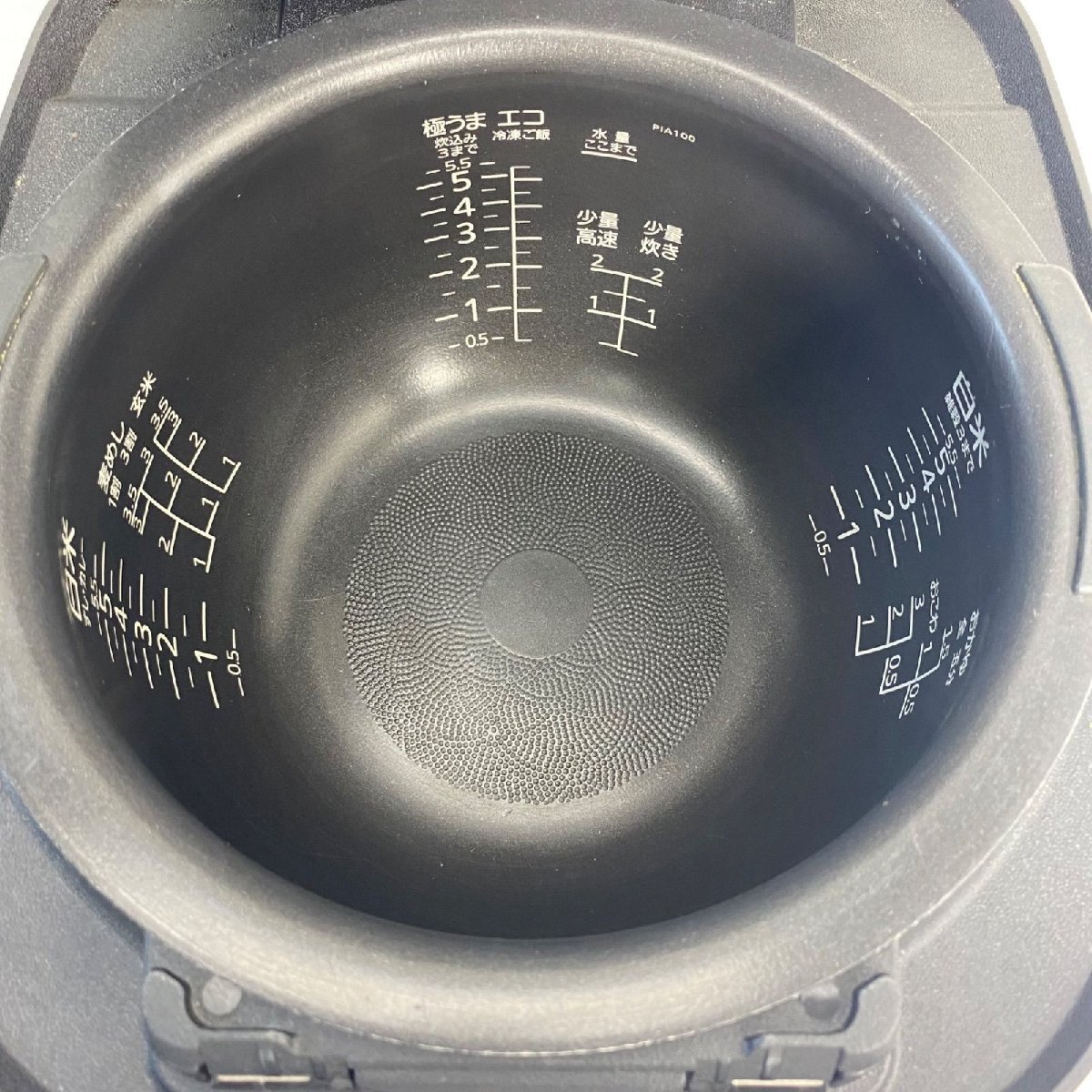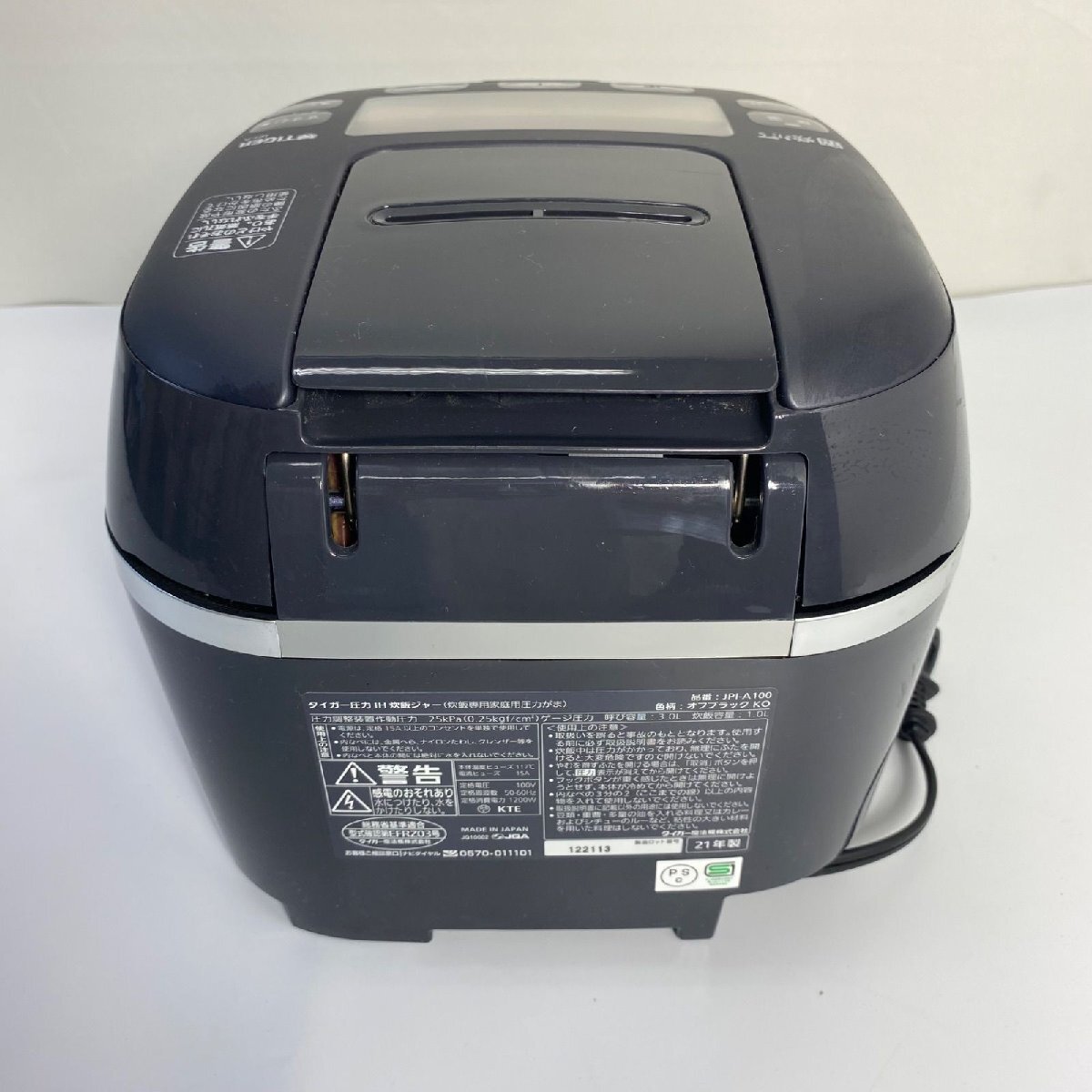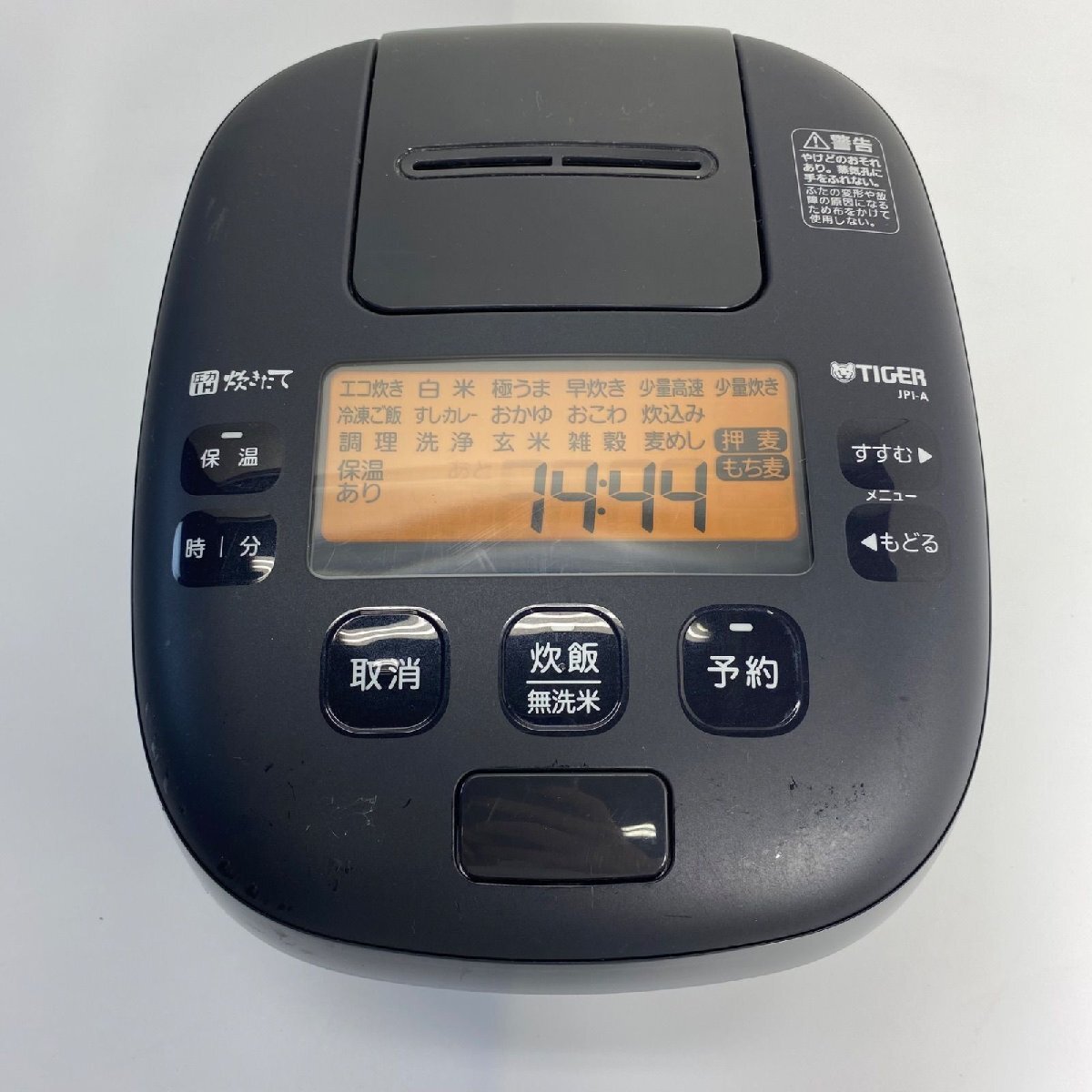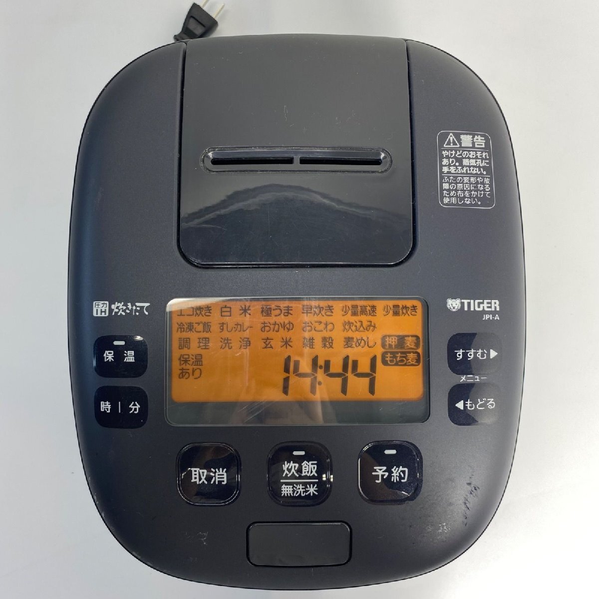 タイガーの圧力IH炊飯ジャー「JPI-A100」です。スタイリッシュなオフブラックカラーで、コンパクトながらも本格的な圧力炊飯が可能な5.5合炊きタイプ。多彩な炊飯モードを搭載しており、白米から玄米、麦ごはんまで幅広く対応しています。