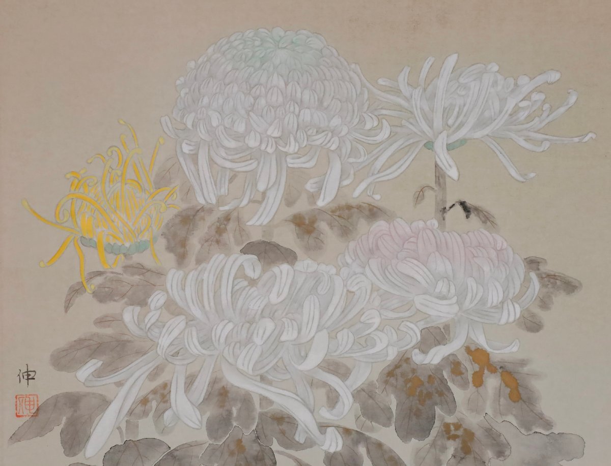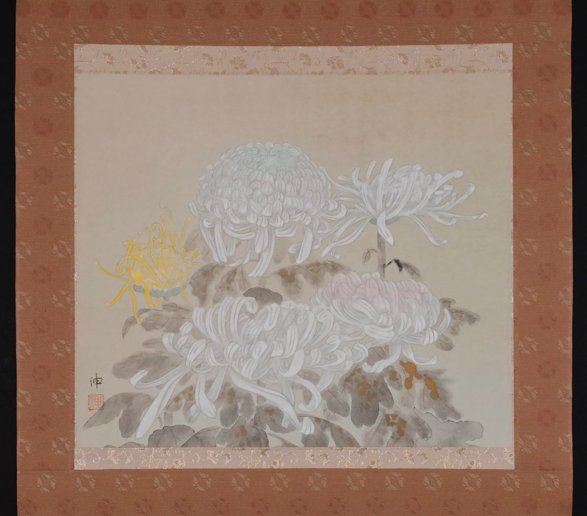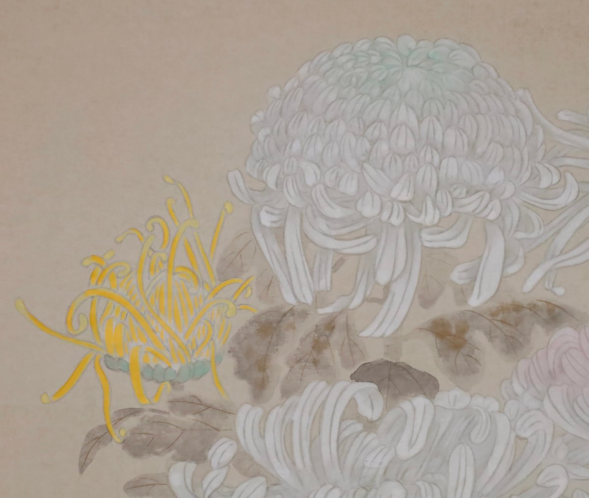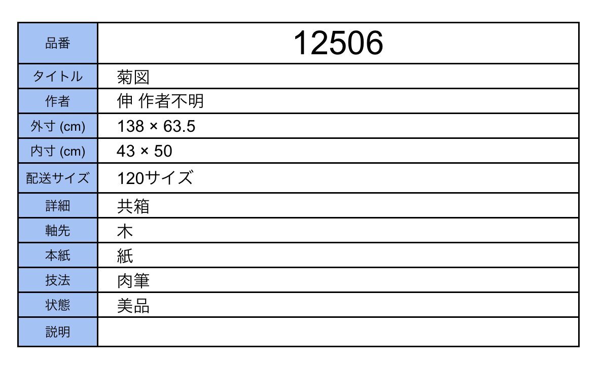 【模写】吉】12506 菊図 伸 作者不明 共箱 茶掛け 茶道具 中国画 掛軸 掛け軸 骨董品
