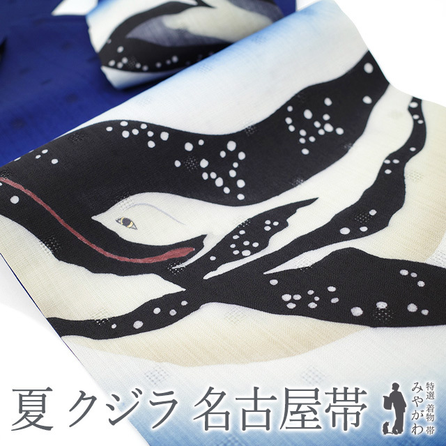夏物 名古屋帯 綺粋庵 麻 九寸 染め帯 すかし織 手染め 青紺地 クジラ 金彩加工 カジュアル 未使用 新古品 仕立て上がり みやがわ sbs54063