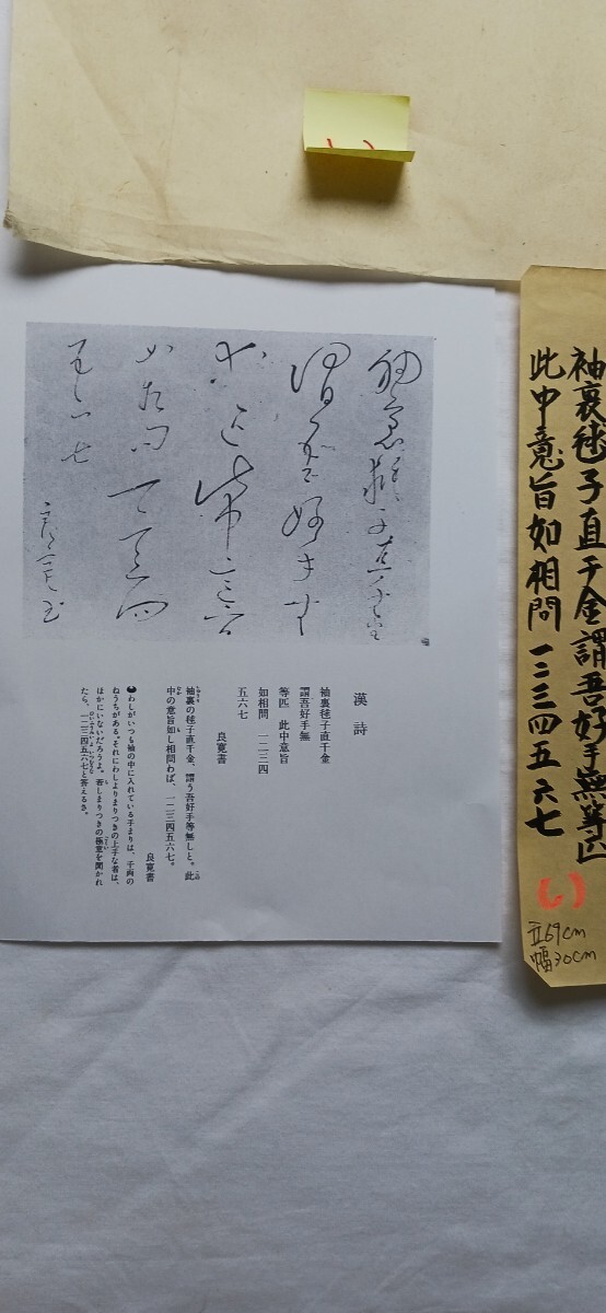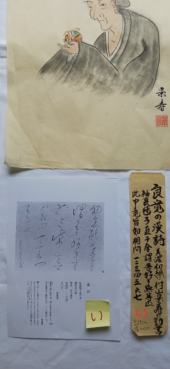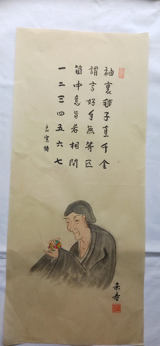 良寛の漢詩で、良寛と手毬の題材です、美濃和紙に村山景寿の真作です、送料無料です、桐箱、表装は付きません、