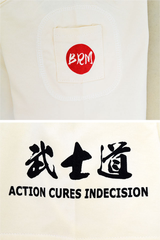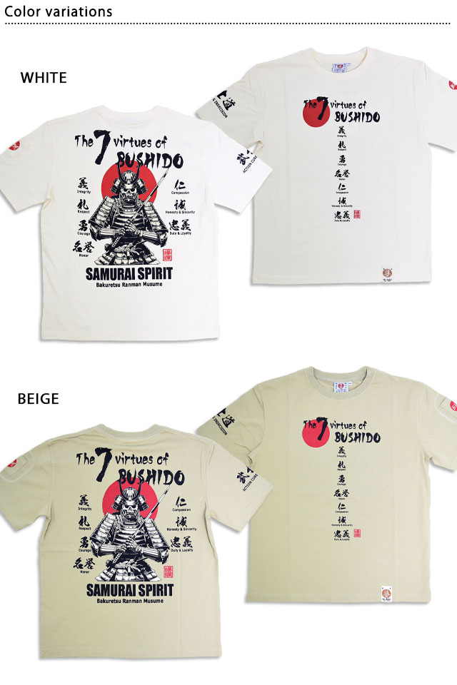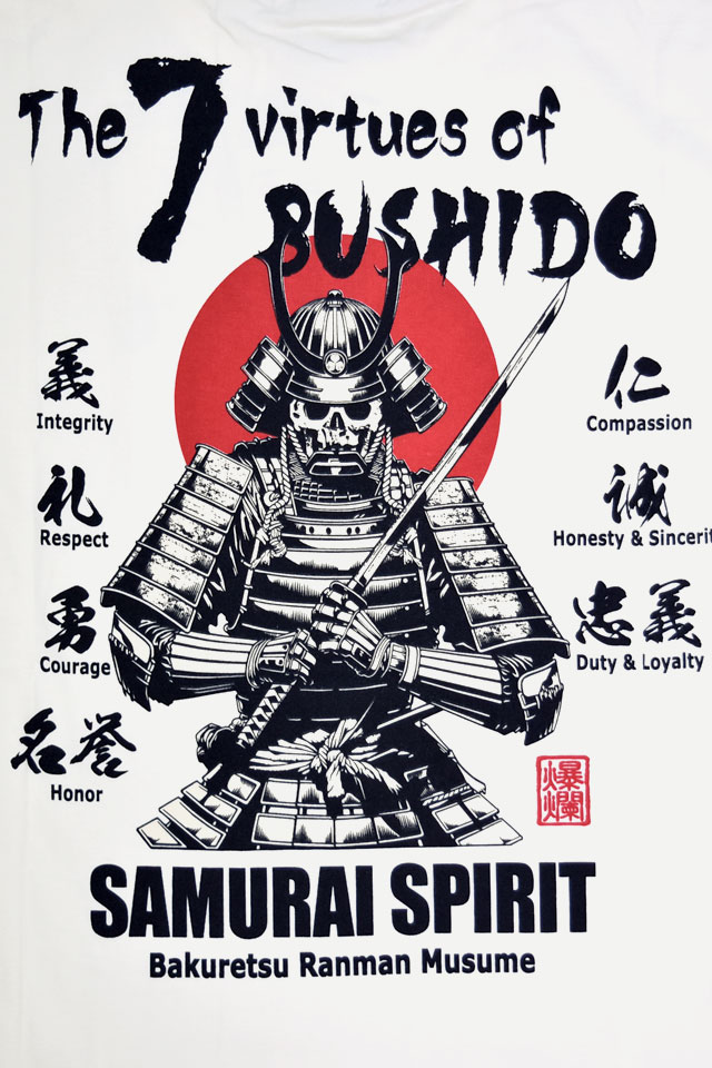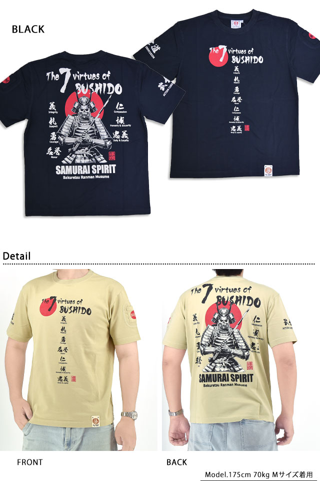 爆烈爛漫娘さんから、半袖Tシャツ「サムライスピリットI」(RMT-343)のご紹介です。 人気シリーズ SAMURAI SPIRITから、新作が今年も登場しました! 日本の侍の魂を感じるデザインです。 フロントには武士道の七つの徳目を日本語の文字で表現されています。 モノトーンなカラーリングの中に、日の丸の赤が綺麗に映えています。 左袖にはフラップ付きのポケットを縫い付けました。 生地には、爆烈爛漫娘お馴染のよれにくくタフなボディーを採用しました。 | |||||||||||||||||||||||||