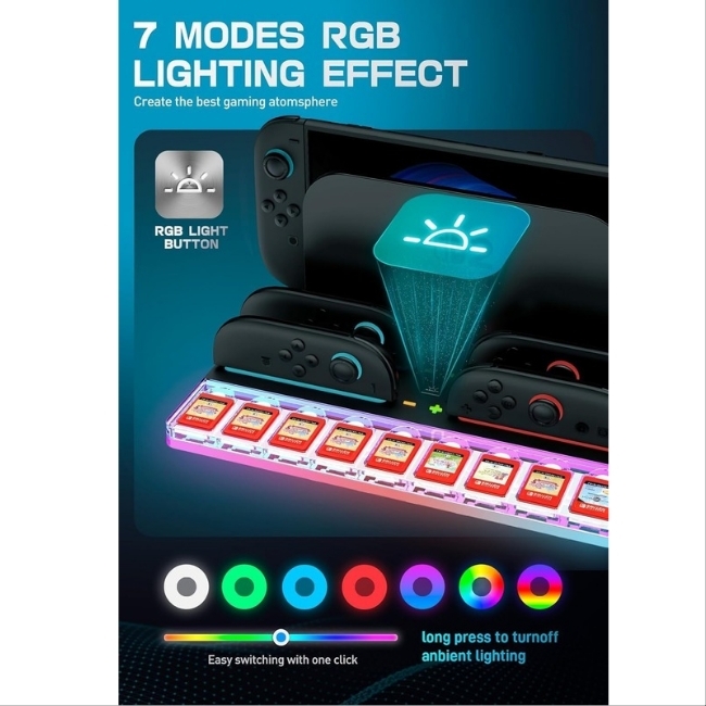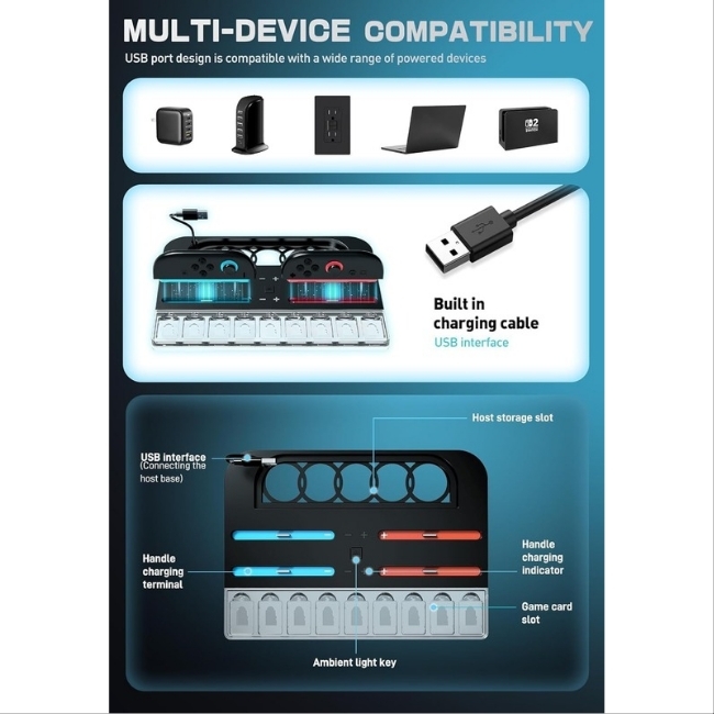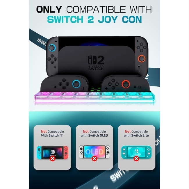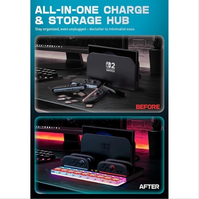 ご覧いただきありがとうございます。 商品名:Switch2 Joy-Con充電スタンド 【この商品が品質で選ばれる理由】 Joy-Conを安全かつ効率的に充電でき、LEDライトで充電状況が一目でわかる充電スタンドです。 ■こんな悩みありませんか? ・大切なSwitch2本体の傷や汚れが気になる ・持ち運び時にSwitch2本体をしっかり保護したい ・ゲームカードやケーブル類をまとめて収納したい ★こんな時におすすめ! ・Switch2本体を安全に持ち運びたい時 ・シンプルで飽きのこないケースを探している時 ・プレゼントとしても喜ばれるデザインを探している時 ------------------------------------- 【洗練されたデスクトップ美学】 ・コンパクトな統合型マルチファンクションデザインで、スペースを節約しながらデスクトップのインテリア性を向上させます。 ・ゲーミング機器の充電ステーションとディスプレイスタンドの両方の役割を果たします。 ・9枚のゲームカード、4台のコントローラー、そしてNintendo Switch 2 公式ドックを収納できる収納機能付きです。 ・底面には滑り止めゴムパッドが取り付けられており、安定性を確保します。 【効率的な充電ステーション】 ・4台のコントローラーを同時充電可能です(USBケーブルを充電器または公式ドックに接続)。 ・1台ずつ充電する手間を省き、マルチプレイゲームのニーズに応えます。 ・家族の集まり、eスポーツトーナメント、日常の練習に最適です。 ・各スロットには強力な磁石が2つ搭載されており、充電中や収納時にコントローラーが落ちるのを防ぎます。 【スマート充電テクノロジー】 ・統合型スマート保護チップを搭載し、過電流・過熱・過電圧・短絡から保護し、過充電によるSwitch 2 Joy Conコントローラーの損傷を防ぎます。 ・3時間(2~4時間)で完全充電し、バッテリー寿命を延長します。 ・充電中はオレンジ色のインジケーターライト(+, -)が点灯し、充電完了/待機モードでは緑色のライトが点灯します。 【スタイリッシュなゲーミング雰囲気】 ・アクリル透光性シェード+LEDアンビエントライトストリップにより、美しさを加えながら暗所での視認性を向上させ、ユニークなゲーミング雰囲気を演出します。 ・タップ操作で7種類のRGBライトモード(走灯、ゆっくり点滅、早め点滅、定光赤/緑/青/白)を切り替えられます。 ・長押しでアンビエントライトを無効化し、充電を継続しながら「光害」を防ぎます。 【互換性】 ・2025年リリースのNintendo Switch 2 Joy Conコントローラー専用に設計されており、他機種との互換性はありません。 ご不明な点などございましたら お気軽に「質問する」からお問い合わせください。 |