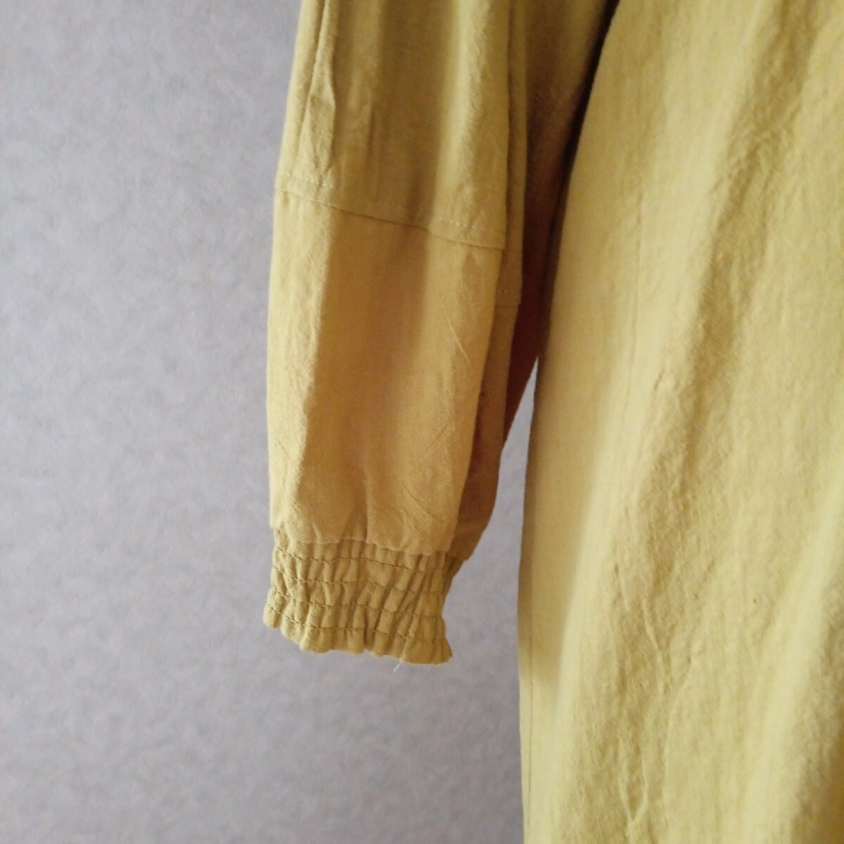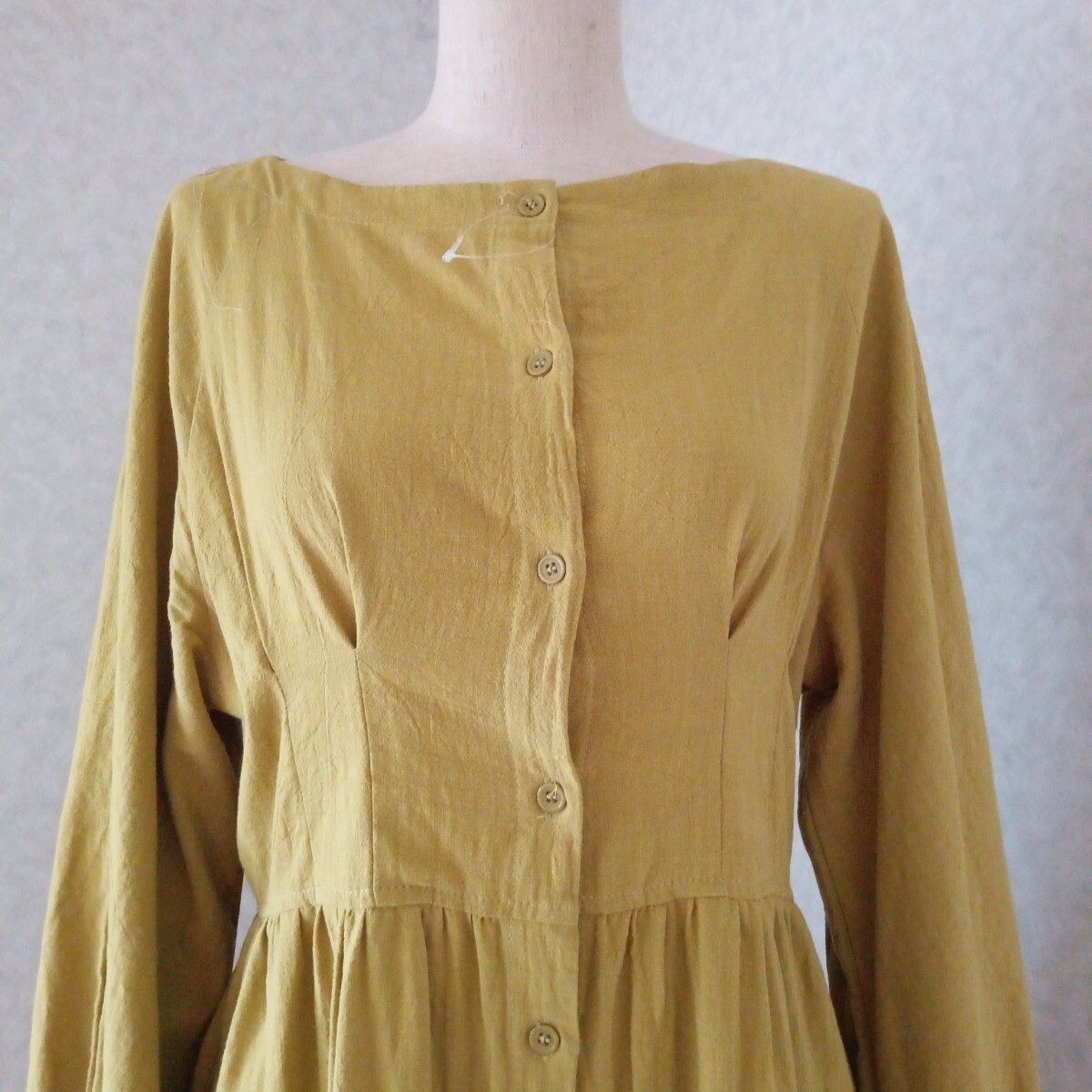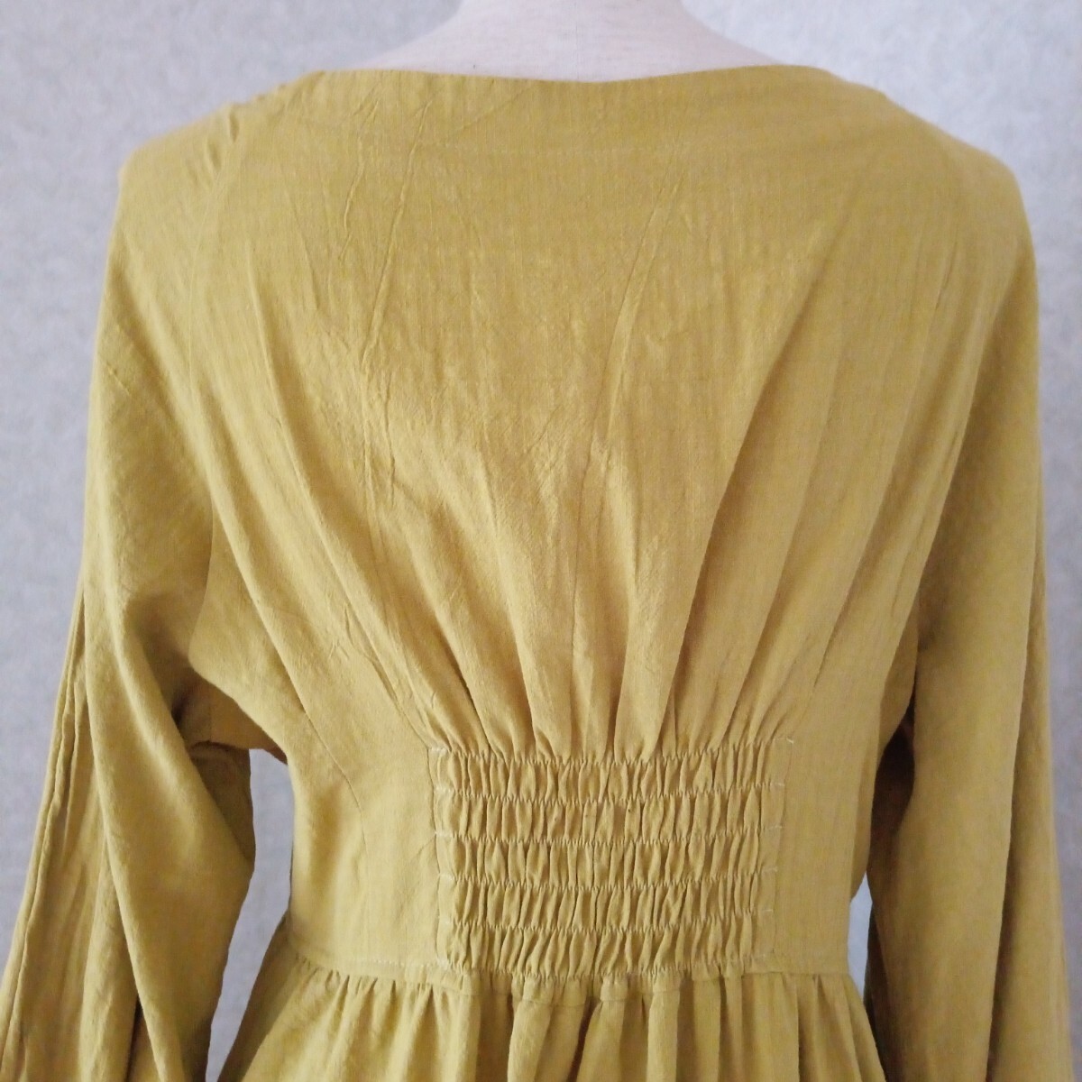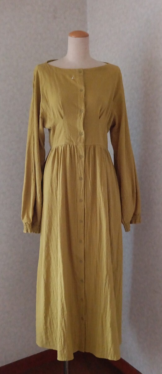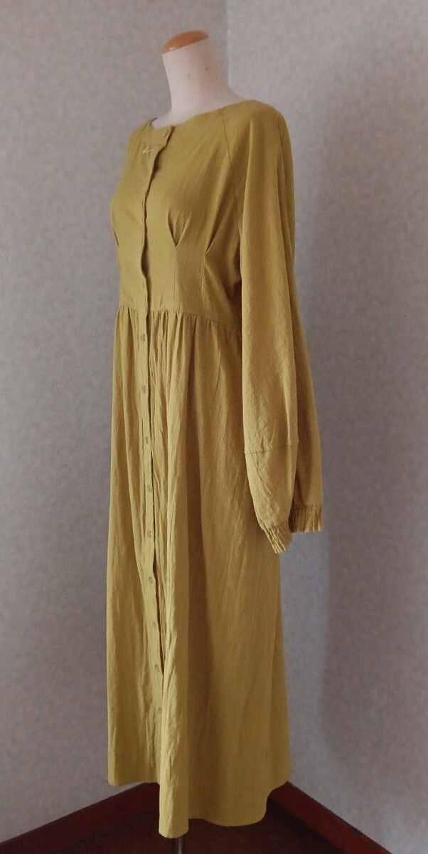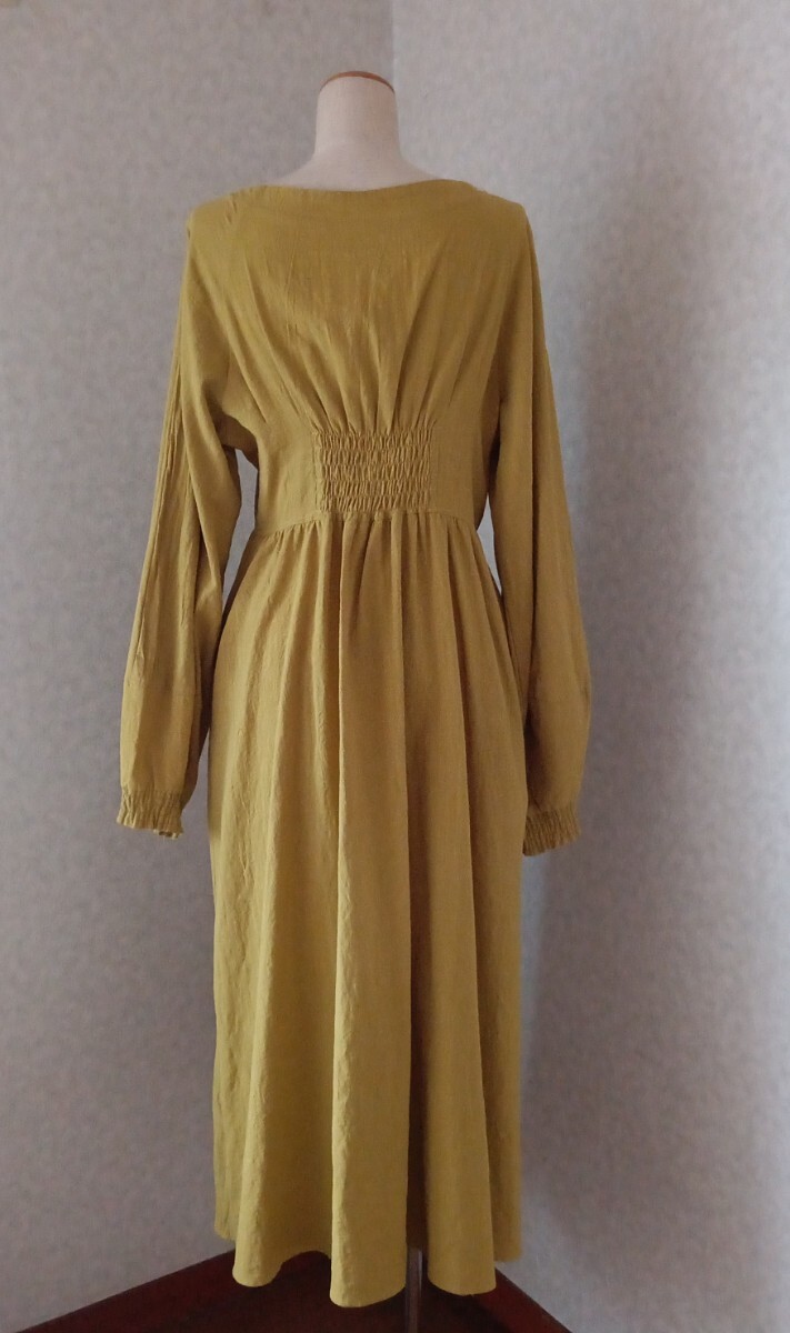 ウエストゴムとボタン付きのマスタード色ロングワンピース。