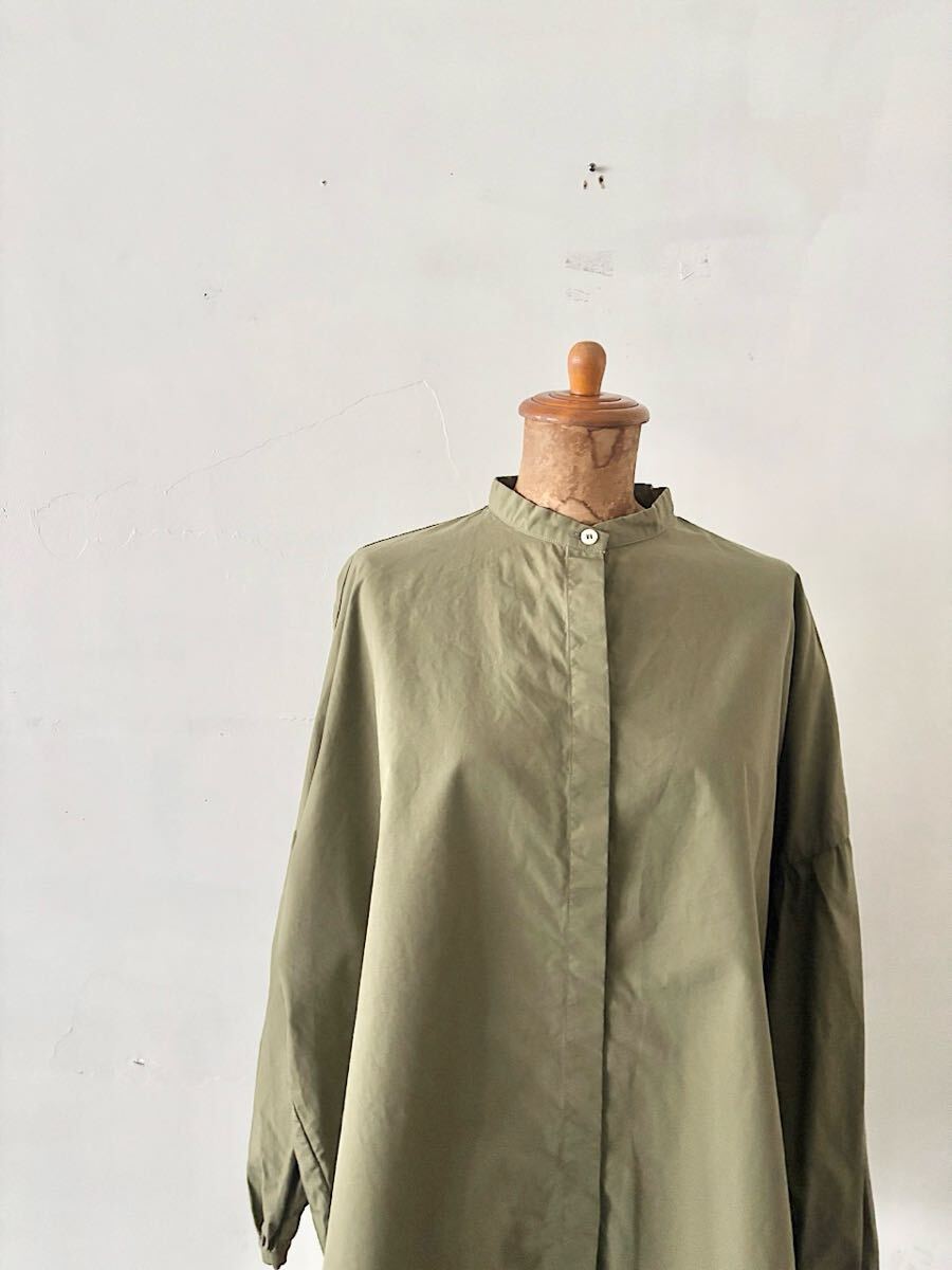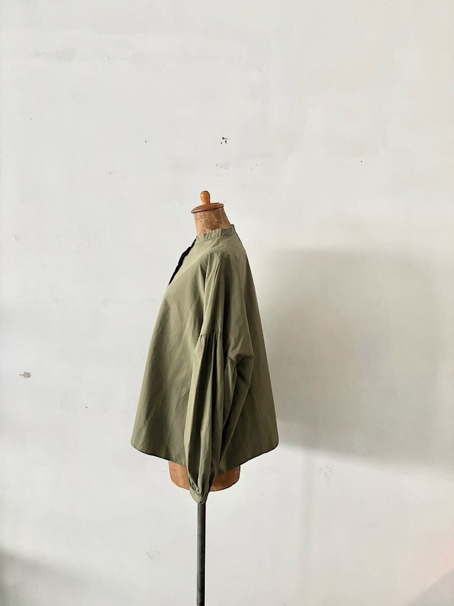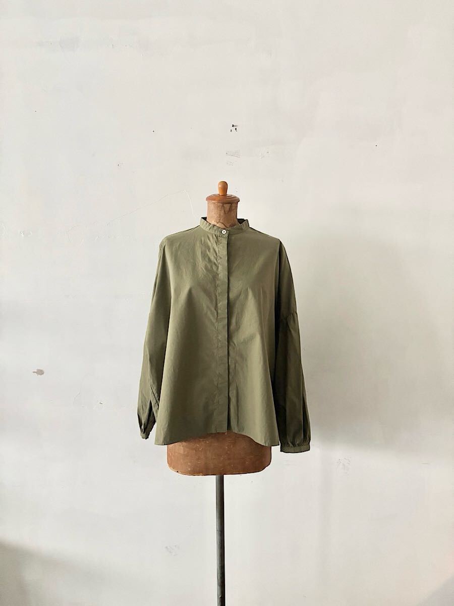 カラーはOlive Drabで袖のギャザーが特徴のふんわりとしたボリュームシャツです。