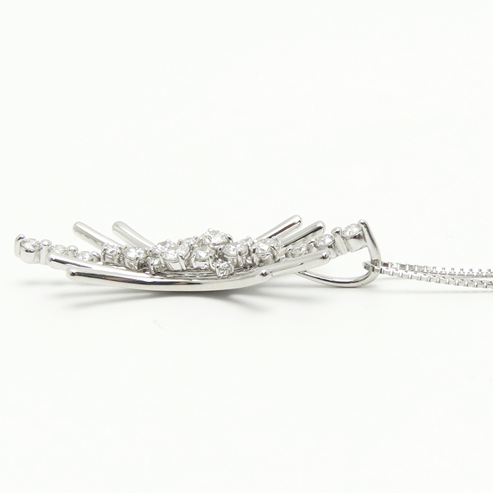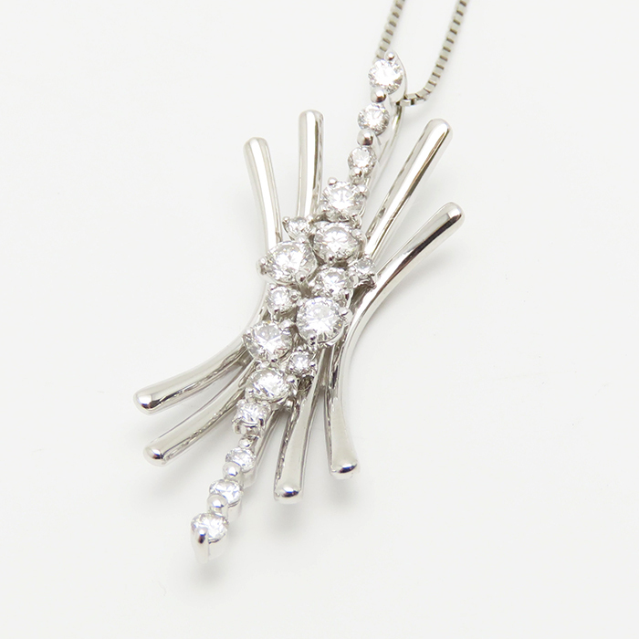 商品説明 | プラチナのチェーンにダイヤモンドが輝くネックレスです。大小様々なダイヤモンドが輝き、繊細でありながらも華やかなトップで、胸元に圧倒的な存在感を放つ商品です。 |