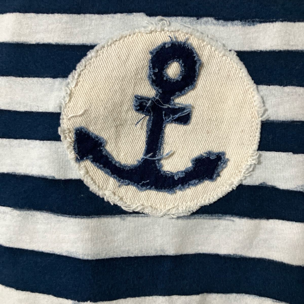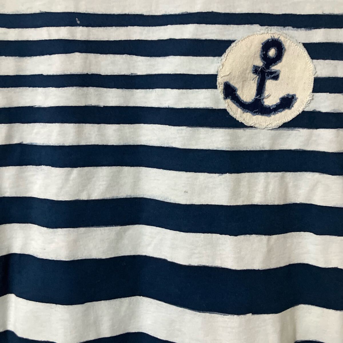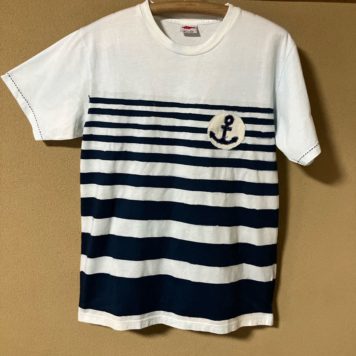 古布で作ったアンカーのワッペンにインディゴ染料で手書きされたボーダー柄のT-シャツです。