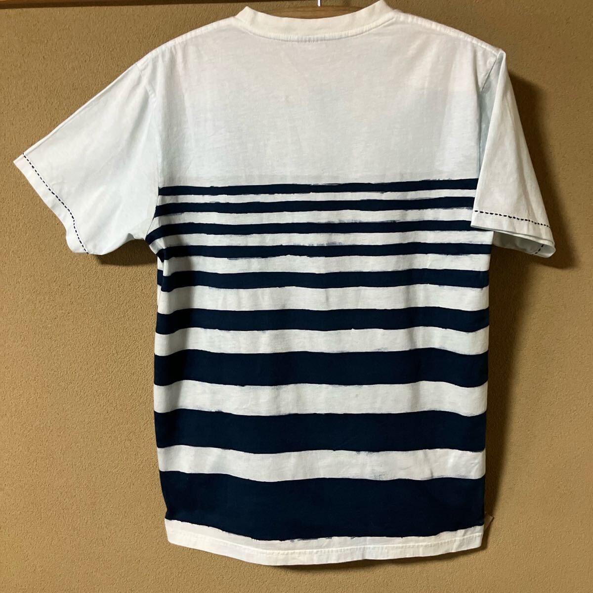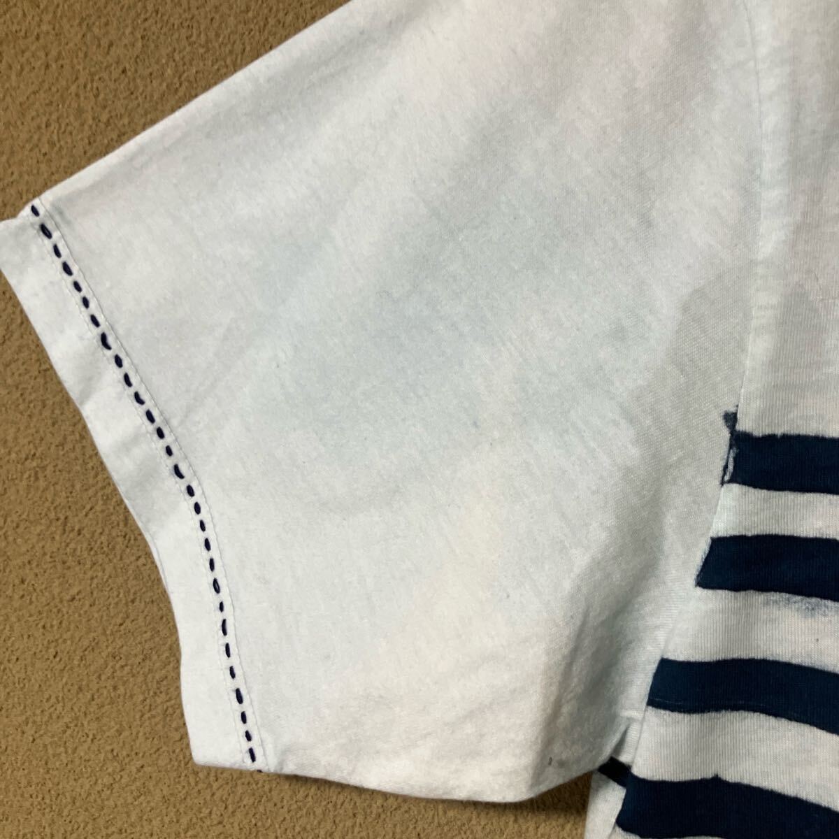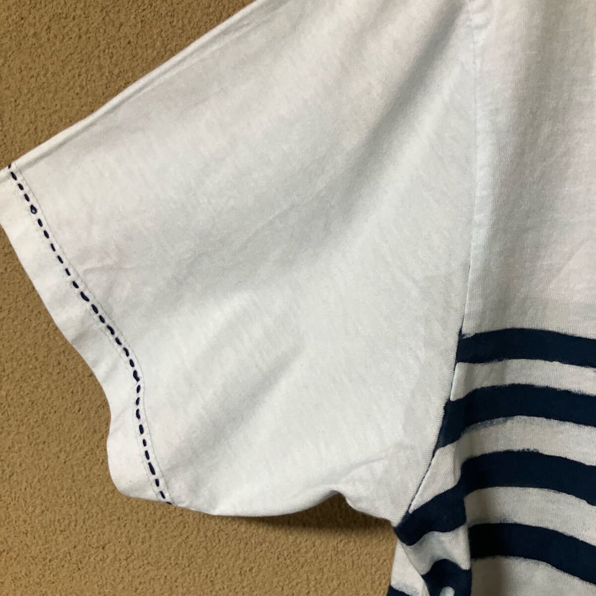 手書きで藍のボーダーから洗い加工時に若干の色落ちがありホワイトのボディーのはずが淡いブルーに仕上がりました。サイズはLになります。便宜上メンズと記載して居ますがレディースとしても着用頂けると思います。