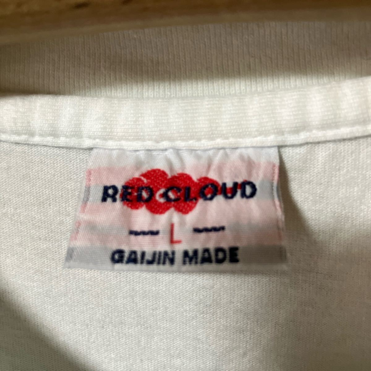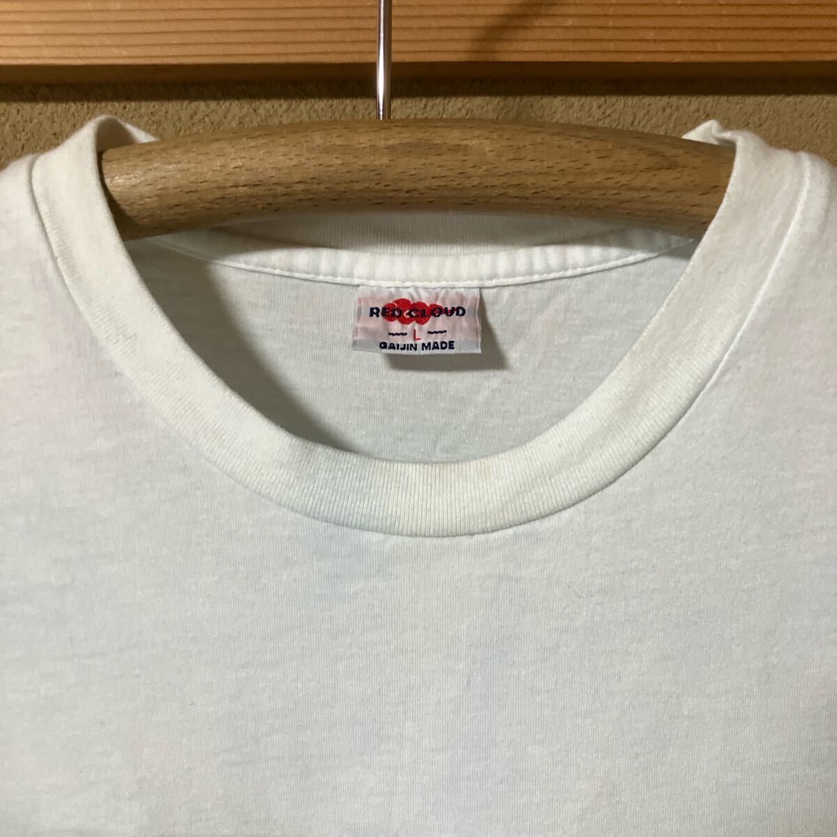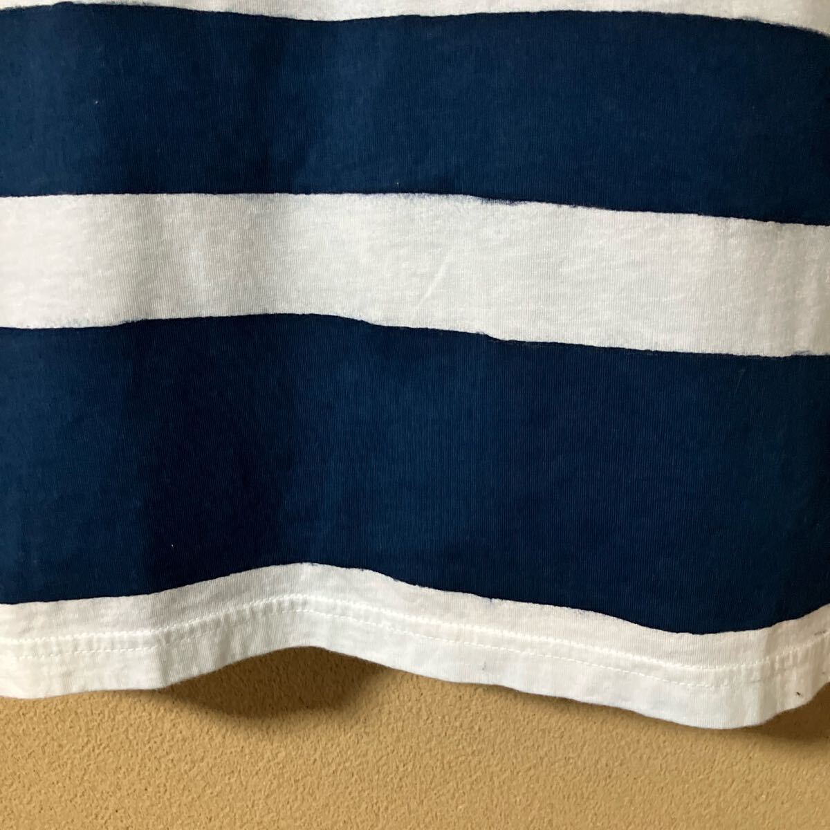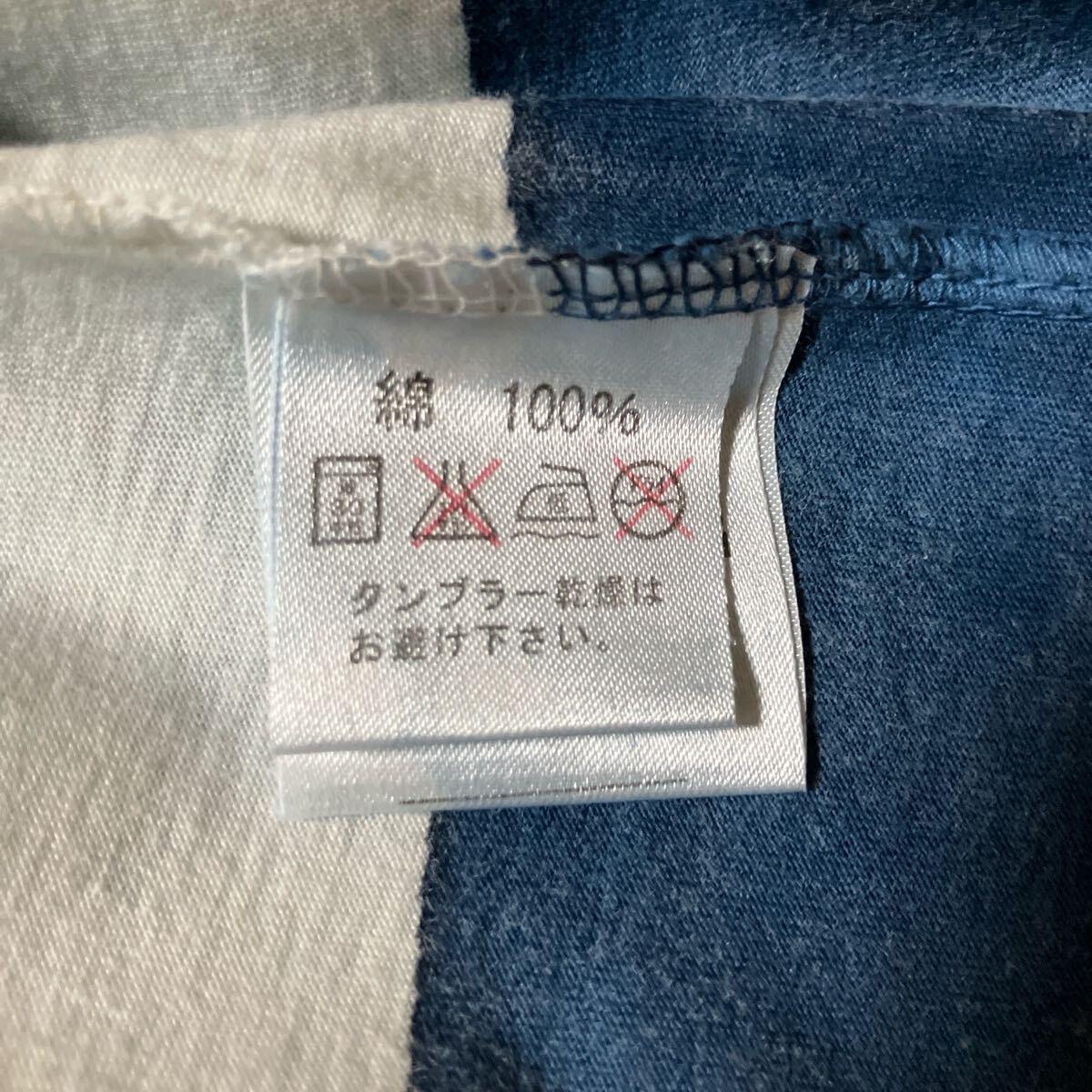 手書きで藍のボーダーから洗い加工時に若干の色落ちがありホワイトのボディーのはずが淡いブルーに仕上がりました。サイズはLになります。便宜上メンズと記載して居ますがレディースとしても着用頂けると思います。